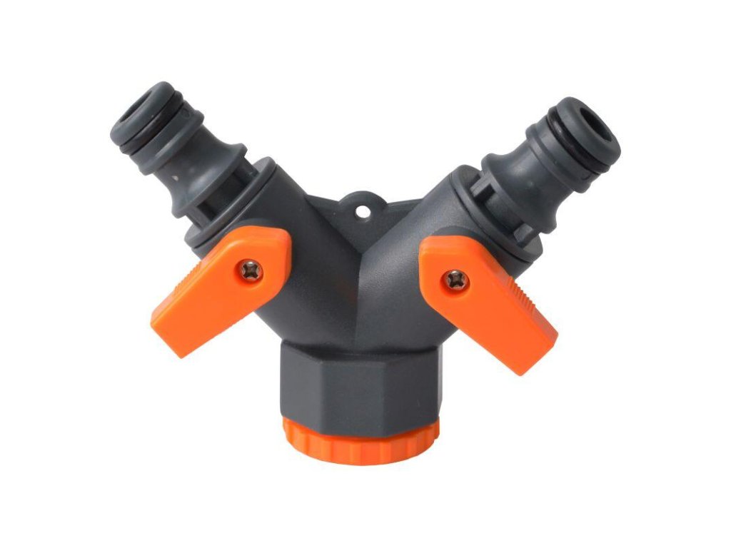 rozdělovač umožňuje současné připojení dvou zahradních hadic k jednomu kohoutku