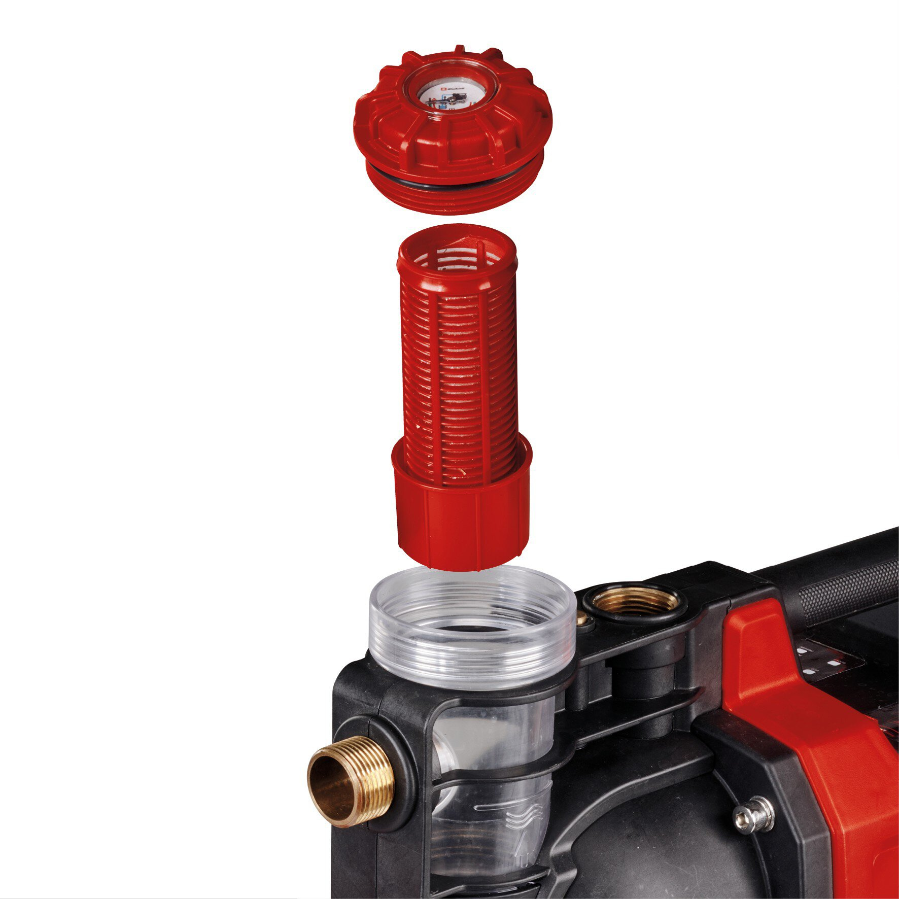 The automatic Einhell cordless garden pump AQUINNA 18/30 F LED AUTOMATIC is a powerful device for flexible use around the home and garden. The pump is part of the Power X‑Change family, where batteries and system devices can be flexibly combined. The pump is operated by an 18 V battery. Thanks to its Double Runtime technology and the two integrated battery slots, the pump can also be equipped with two batteries for a longer running time. The charge left in the two batteries can be seen from the LED charge indicator at any time. Also integrated is an LED status display, which provides information about the pump status and possible error messages. The automatic garden pump is equipped with two power modes: A BOOST mode for maximum output and an ECO mode for maximum battery life at lower delivery pressure. This cordless water pump can pump up to 3000 litres per hour. You can have a max. delivery height of 28 metres, corresponding to a max. delivery pressure of 2.8 bar. Water can be sucked up from a depth of up to 6 metres. Suction height and suction pressure can be read off the pressure gauge. The integrated pressure switch automatically switches the pump on when water is required and then switches it off again. For simple filling, the pump has a large water filler screw. The pump is easily emptied, especially to protect it against frost in winter, with the help of the water drain plug. To protect against contamination, the pump is equipped with a pre-filter. A non-return valve also prevents the water level from dropping. In the event of overheating, the device is automatically switched off by the overload protection to prevent damage. In addition, the pump is protected by a dry-run protection device. The cordless domestic water system is equipped with a central carrying handle for easy transportation and with fastening holes for fixing in a permanent place of use. The pump is equipped with two robust metal construction threaded connections. The tool does not include a battery or charger, which are available separately.