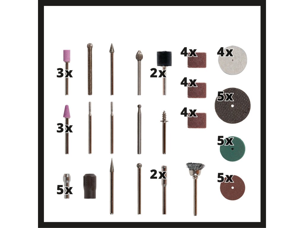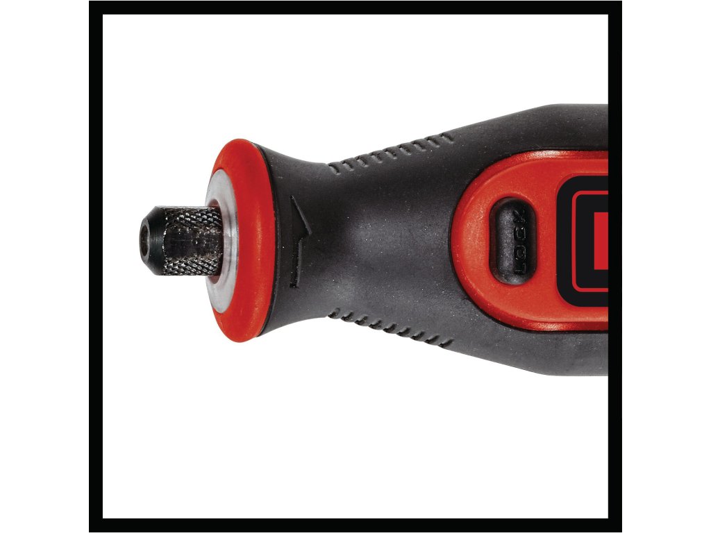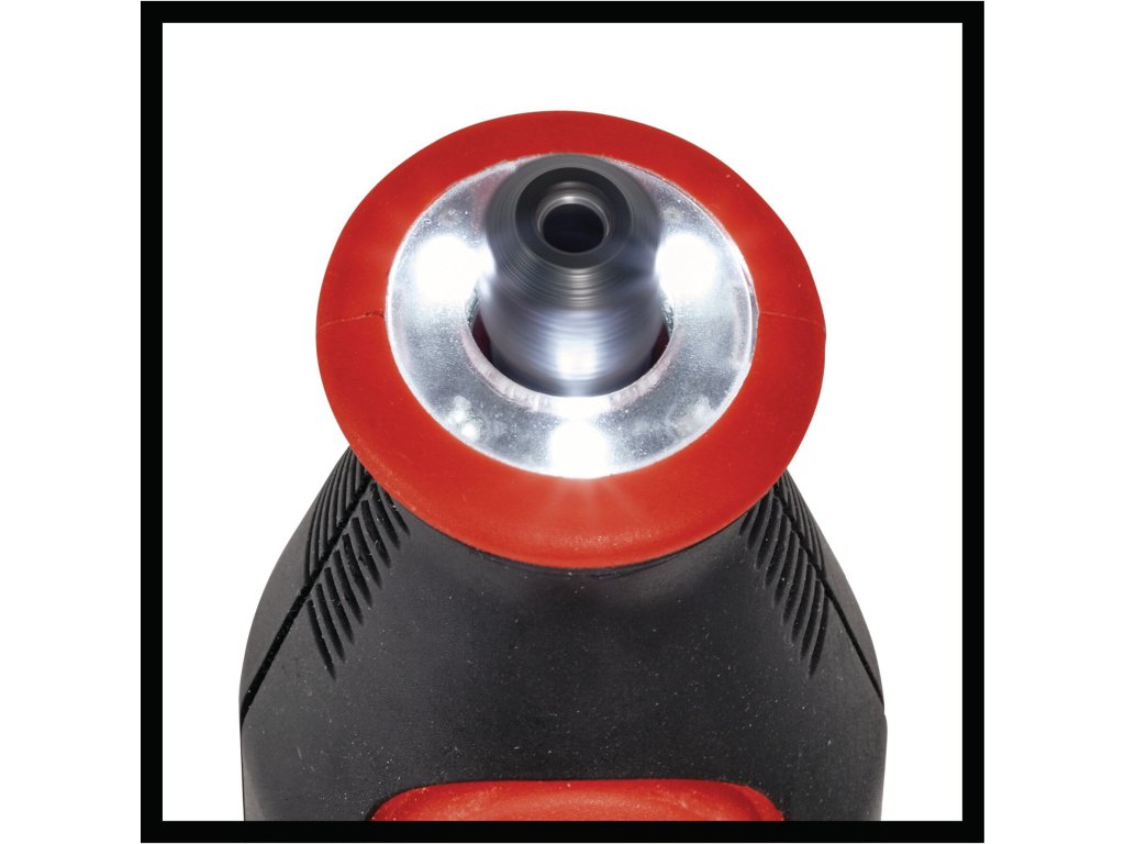 Akumulátorová vysokorychlostní bruska na gravírování Einhell TE-MT 7,2 Li je univerzálním nástrojem pro nejrůznější požadavky při provádění rytí, frézování, broušení a kartáčování při řemeslných pracích v domácnosti, dílně nebo garáži. Elektronická regulace otáček s LED displejem, napájená dobíjecí baterií s dlouhou výdrží (7,2 V | 1 500 mAh), zajišťuje, že nářadí je vždy přesně přizpůsobeno požadavkům každého materiálu a v každé situaci – s rychlostmi 5 500 až 26 000 ot./min. Pro snadnou výměnu nástrojů je k dispozici aretační knoflík. LED světelný prstenec zajišťuje optimální osvětlení obrobku pro efektivnější práci. Ergonomická měkká rukojeť navíc zajišťuje bezpečné uchopení a optimální přesnost. Pro broušení i gravírování je nástroj trvale připraven k použití díky přiložené nabíječce. Výrobek je navíc dodáván také s rozsáhlou 57dílnou sadou příslušenství v praktickém úložném boxu, takže potenciálních využití je nespočetDoplňkové parametry