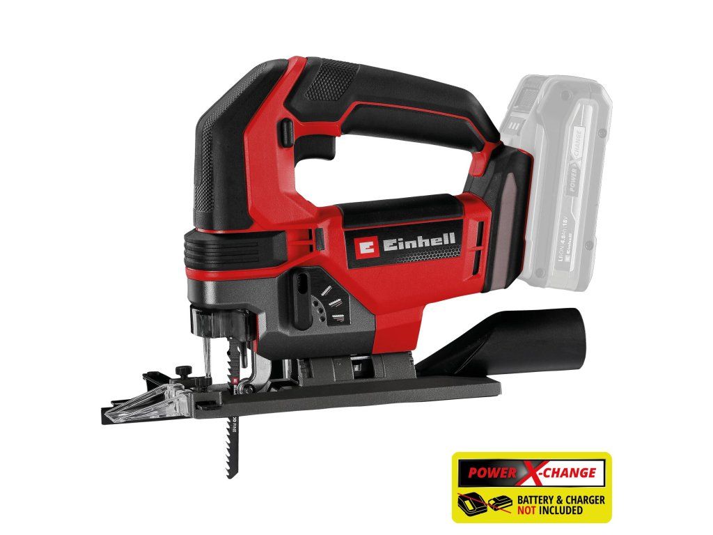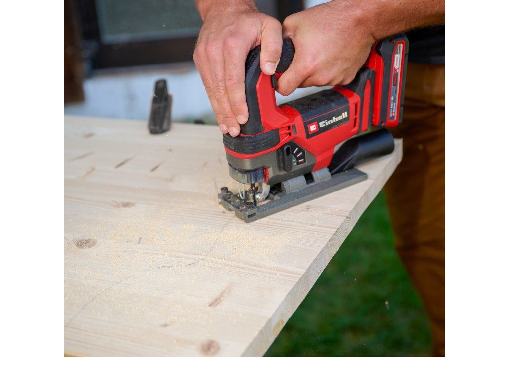 The Einhell Cordless Jigsaw TE-JS 18/100 Li-Solo is a compact saw for precise cuts in different materials. As a member of the Power X-Change family, it can be used in combination with any battery or charger from the system. With its high running smoothness, the cordless jigsaw achieves precise cuts. For faster cuts, the pendulum stroke can be engaged, so the saw blade moves not just vertically, but also horizontally forward. The powerful cordless jigsaw can achieve cuts up to 100 mm deep in wood and 12 mm in steel, as well as making bevel cuts of up to 45°. It also features a convenient cutting line indicator and an LED light for illuminating the cutting area. The electronic speed control enables the tool to be perfectly matched to the material and task at hand. The toolless saw blade holder allows quick and easy changes of saw blade. The jigsaw can be used with all standard U- and T-shank saw blades. Optimum visibility when working is ensured by the dust blow-off function and the included suction adapter, which can be connected to an Einhell wet/dry vacuum cleaner with a Ø 36-mm connector, for example. The plastic shoe cover integrated into the robust saw shoe protects delicate workpieces and prevents scratches. A splinter guard ensures tear-free cuts. For especially straight cuts, the supplied parallel guide can be attached to the jigsaw. Includes one jigsaw blade for wood. The product does not include a battery or charger. These are available separately, for example in a convenient starter set.