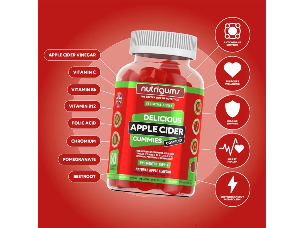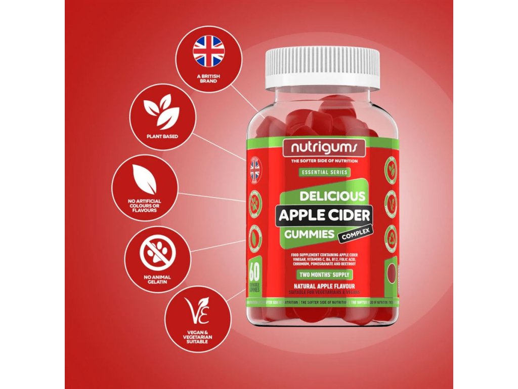 Jablečný ocet (vyrobený z jablečného moštu fermentací) je populární zejména v USA a UK jako harmonizační přírodní složka pro kontrolu chuti k jídlu a regulaci návalů hladu. Má rovněž vlastnosti související s hladinou cukru a cholesterolem. V želé NUTRIGUM® si jej můžete vychutnat bez typické trpké chuti.