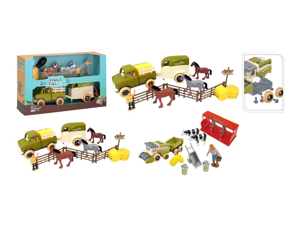 Sada farmářské auto s přívěsným vozíkem, včetně figurek zvířat, lidí a dalšího příslušenství.