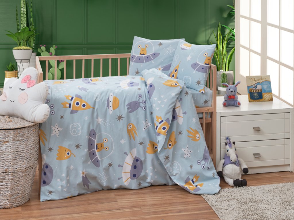 Toto dětské povlečení má zábavný a barevný vesmírný motiv, který nadchne malé objevitele. Na světle modrém podkladu jsou rozmístěny ilustrace raket, létajících talířů, planet, hvězd, komet a roztomilých mimozemšťanů v oranžové, bílé, fialové a šedé barvě. Některé rakety mají dokonce plameny, jakoby právě startovaly do vesmíru, což dodává vzoru dynamiku. Design je hravý, přitom ale přehledný a uklidňující díky pastelovým barvám. Povlečení je ideální pro děti, které milují vesmír, rakety a fantazii plnou dobrodružství. Hodí se do chlapeckých i dívčích pokojíčků a skvěle doplní moderní interiér.