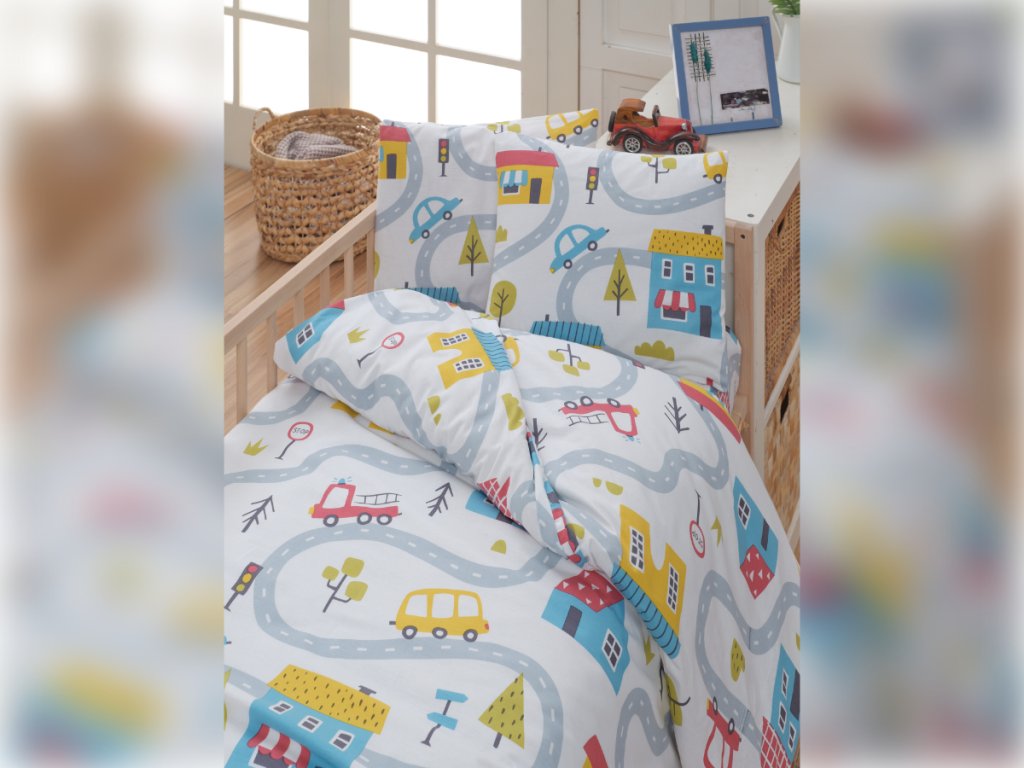 Vzor dětského povlečení je veselý a hravý, inspirovaný motivem města a silnic. Na bílém podkladu se vine šedá klikatá silnice, po které jezdí barevná autíčka, autobusy, hasičská auta a další dopravní prostředky. Silnici lemují domečky, stromy, značky a další městské prvky v pestrých odstínech modré, červené, žluté a růžové. Celkový design povlečení podporuje dětskou fantazii a je jako stvořený pro malé milovníky aut a objevování. Barevné provedení je radostné a podněcující k hravosti, přičemž zůstává dostatečně jemné pro klidné usínání.