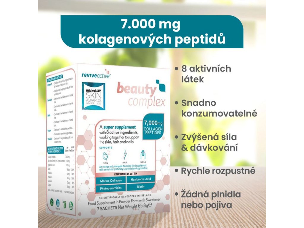 Beauty Complex je speciálně navržený pro ženy, je vhodný pro všechny věkové skupiny. Beauty Complex není jen další multivitamín, jde o superdoplněk s množstvím účinných látek, které je pro multivitamíny zcela netypické. Beauty Complex se od jiných produktů odlišuje unikátní a velmi silnou kombinací unikátních biaoktivních složek jako je kyselina hyaluronová, kolagenní peptidy, fytoceramidy kombinovaných s vitamínů a minerálů. Prášek je snadno rozmíchatelný ve vodě nebo libovolném nápoji. Jeden sáček dodá potřebné mikronutrienty pro celý den. Doplněk je vhodný pro vegany, je kompletně bez lepku a je slazený steviol-glykosidy.