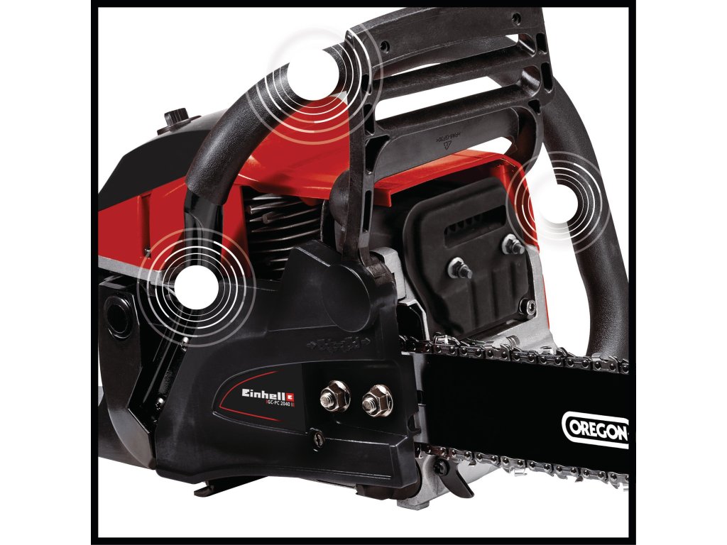 Benzínová řetězová pila Einhell GC-PC 2040 I kombinuje výkon s ostrostí a bezpečnost se snadnou manipulací. Kombinace kvalitní benzínové řetězové pily Einhell a kvalitní lišty a řetězu OREGON zajišťuje, že zahrádkáři stojí po boku silný a spolehlivý partner. Ať už na zahradě, na dvoře nebo v dílně: benzínová řetězová pila je univerzál pro jednoduchou a hrubší práci se dřevem. Vzduchem chlazený dvoutaktní motor s klikovou hřídelí s ložisky po obou stranách je silným pohonem a poradí si dokonce i s nepoddajným dřevem: Větve a hranoly, obrobky a palivové dříví proti benzínové řetězové pile nic nezmůžou. Díky celé řadě technických podpůrných funkcí je manipulace s benzínovou řetězovou pilou od Einhell snadná a bezpečná. Antivibrace tlumí nárazy při provozu – tímto způsobem jsou šetřeny síly uživatele. Snadné nastartování umožňují pomůcky pro studený start „primer“ a automatický sytič. Díky digitálnímu zapalování je zaručen rychlý a dynamický příjem směsi paliva a vzduchu a stabilní chod motoru. Optimální bezpečnost uživatele zajišťuje ochrana proti zpětnému rázu s okamžitou brzdou řetězu. Ta se aktivuje bezprostředně při vymrštění pily, řetěz se tak okamžitě zastaví. Benzinová řetězová pila je navíc vybavena zachytávačem řetězu, což minimalizuje riziko i při vyskočení řetězu. Velký a robustní ozubený kovový doraz zajišťuje bezpečné a pohodlné vedení při všech pracích. Automatické mazání řetězu dodává řetězu dostatečné množství oleje. Optimální uložení zajišťuje přiložený kryt lišty. Dodávka zahrnuje nádobu na míchání benzínu a oleje.Doplňkové parametry