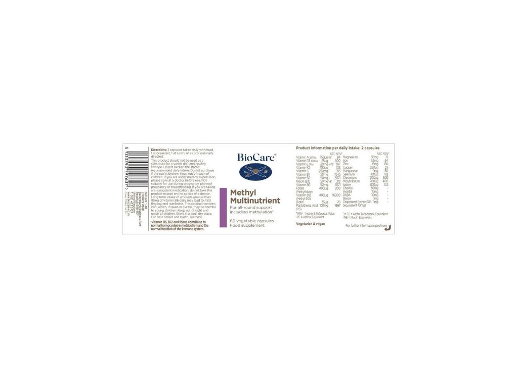 BioCare Methyl multivitamin obsahuje komplex vitamínů a minerálů pro všestrannou podporu organismu. Díky svému unikátnímu složení podporuje proces metylace, který je nezbytný pro normální fungování organismu. Kromě toho tento přípravek působí jako podpora duševní pohody, energie či hormonální rovnováhy. Pomáhá bojovat proti únavě a obsahuje látky, které jsou přirozené antioxidanty a chrání tak buňky před oxidačním stresem. Díky svému složení je vhodný i pro vegany a vegetariány.Účinné látky