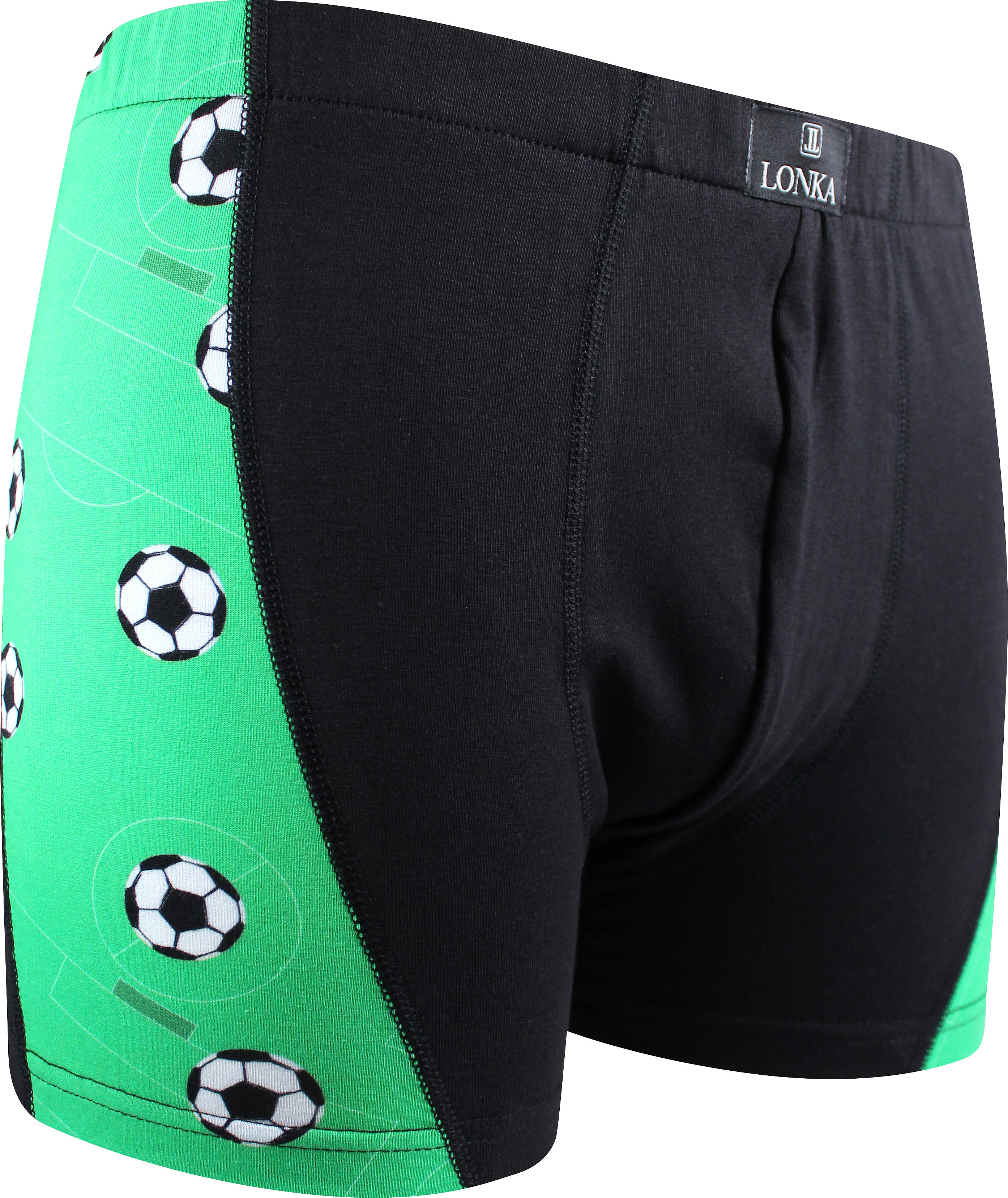 Pánské elastické boxerky Lonka® KAMIL FOTBAL jsou trendy boxerky přiléhavého střihu. Přírodní bavlněný úplet je doplněný o pružný elastan, takže boxerky perfektně padnou. Zadní díl je vcelku a přední část je dvouvrstvá, díly jsou sešité plochými švy pro maximální pohodlí. Guma se nedotýká pokožky, je skrytá v úpletu. Pánské boxerky mají boční vsadku s fotbalovými motivy, ideální pro každého fotbalistu na každodenní nošení.