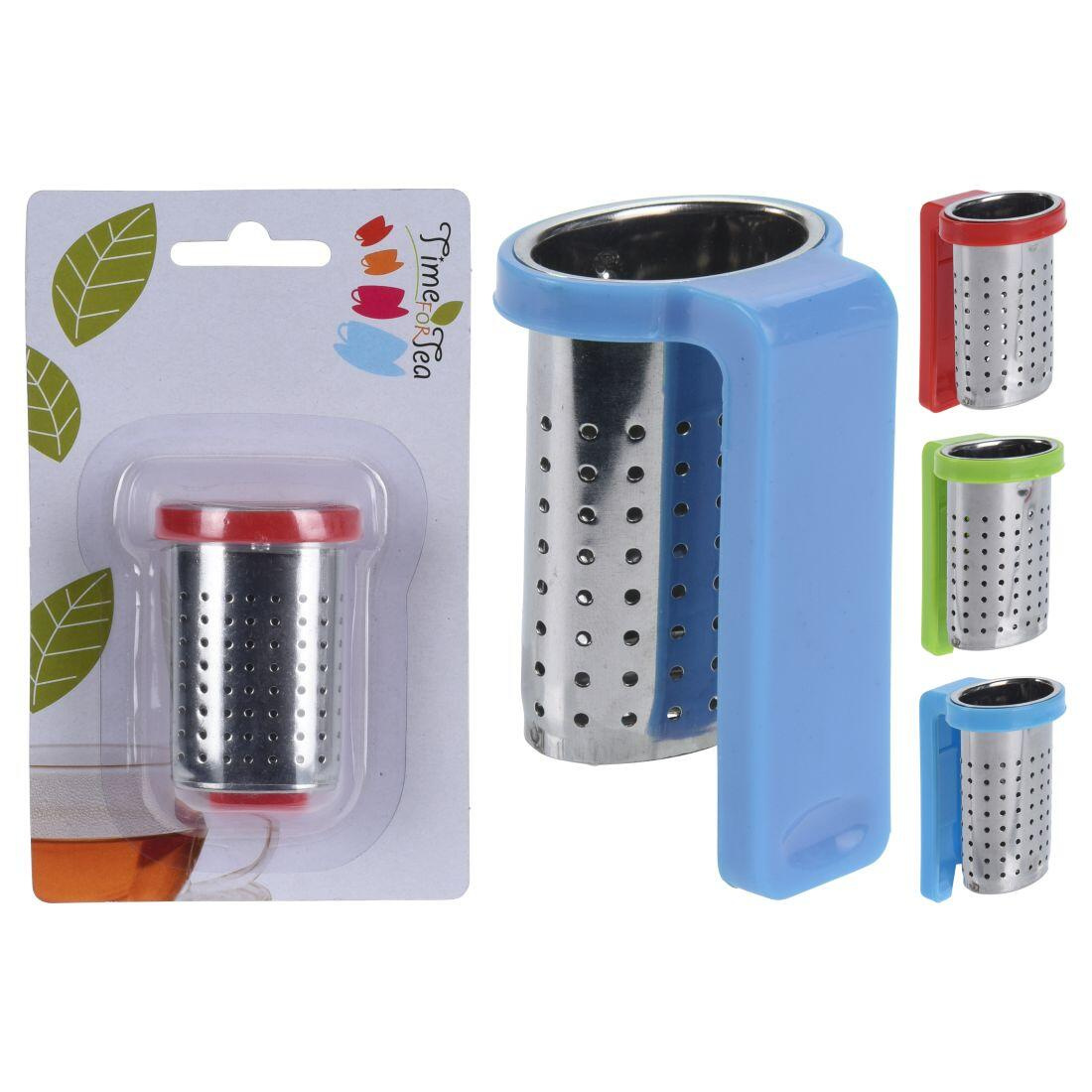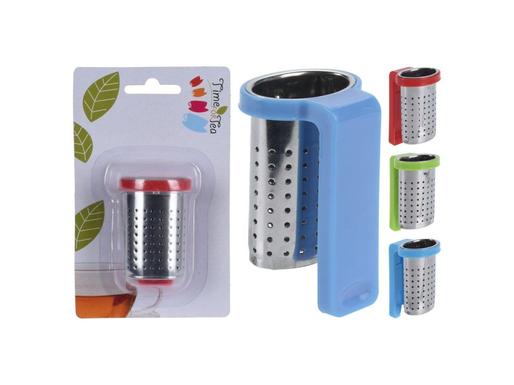 Závěsné čajítko na sypaný čaj s plastovým držákem pro zavěšení na okraj hrnku.