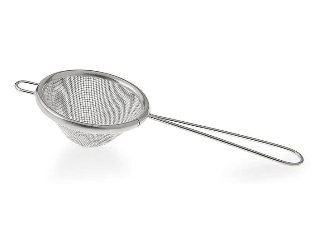Kovové tkanivo je pevně spojené s obrubou z ocelového plechu a držadlem s háčky z ocelového drátu, galvanicky leskle pokoveno.