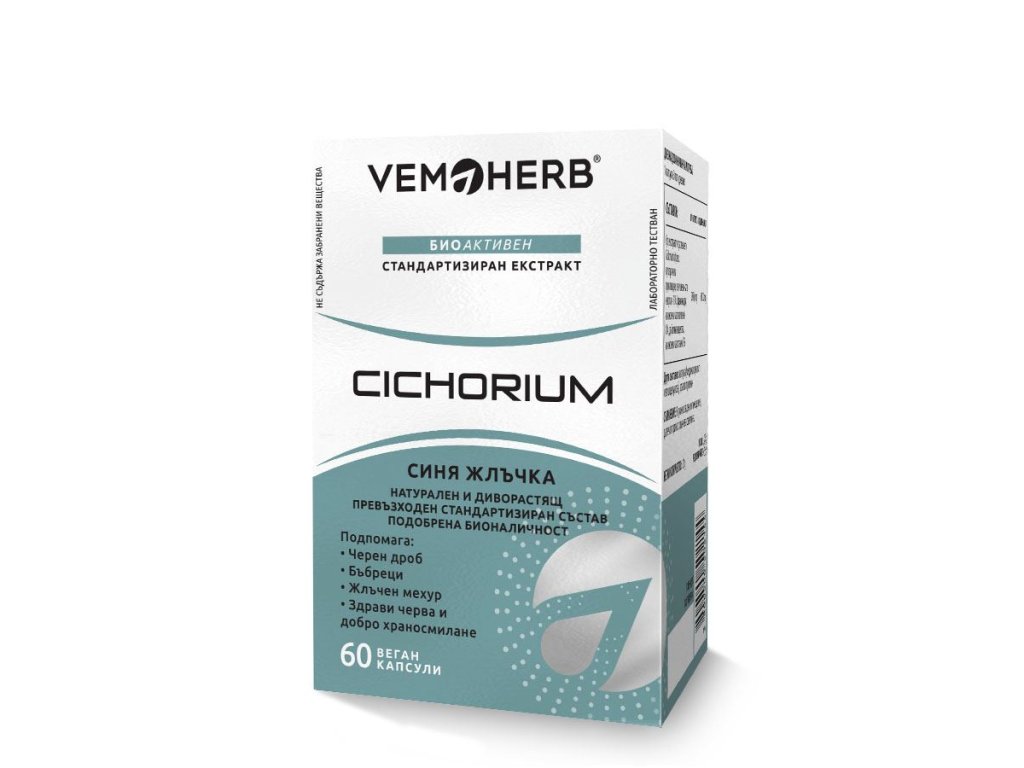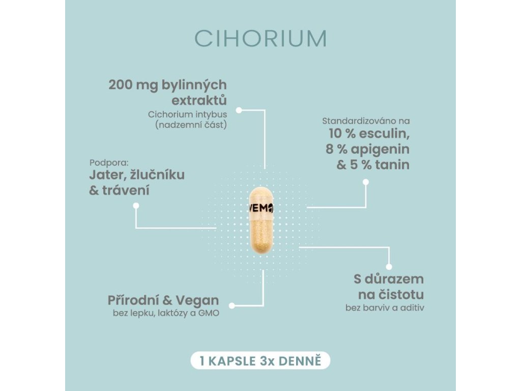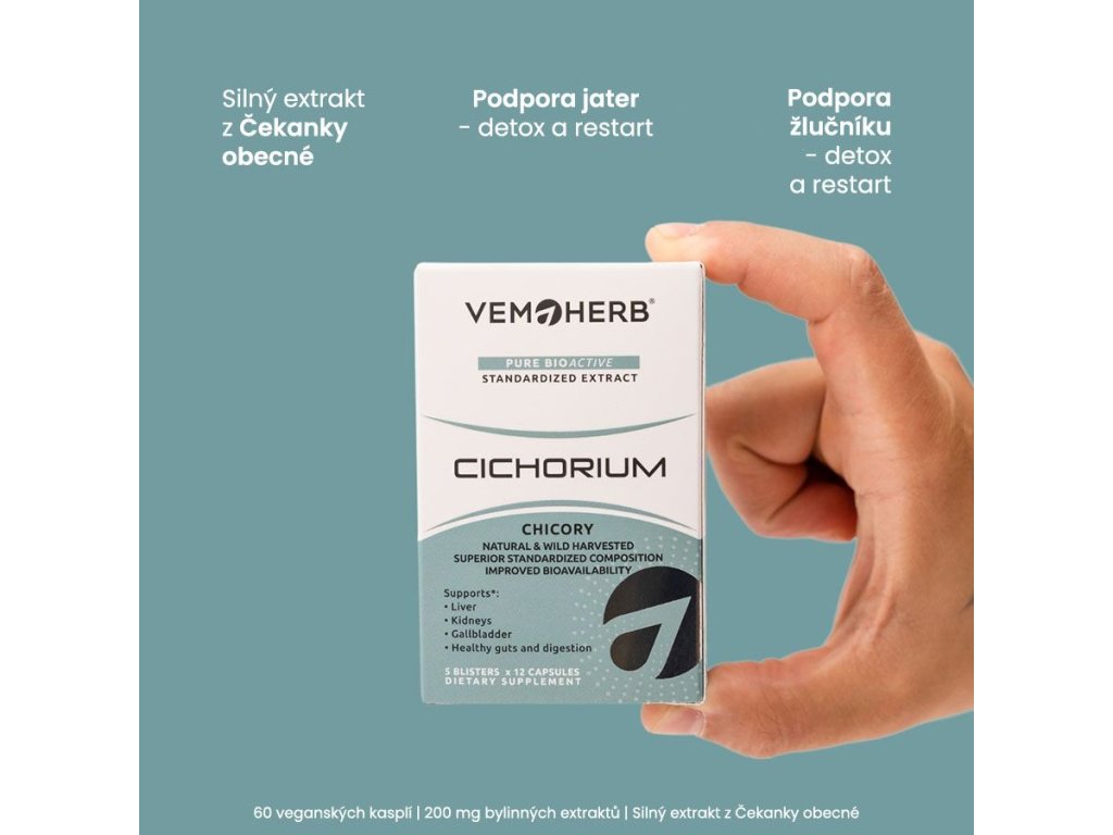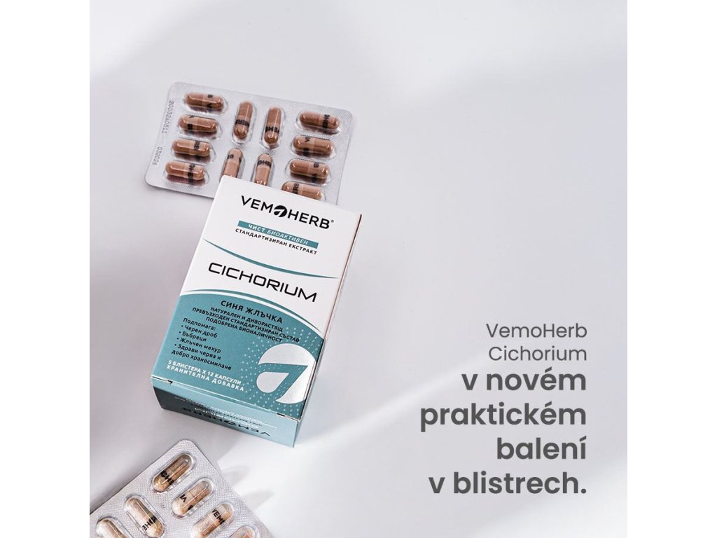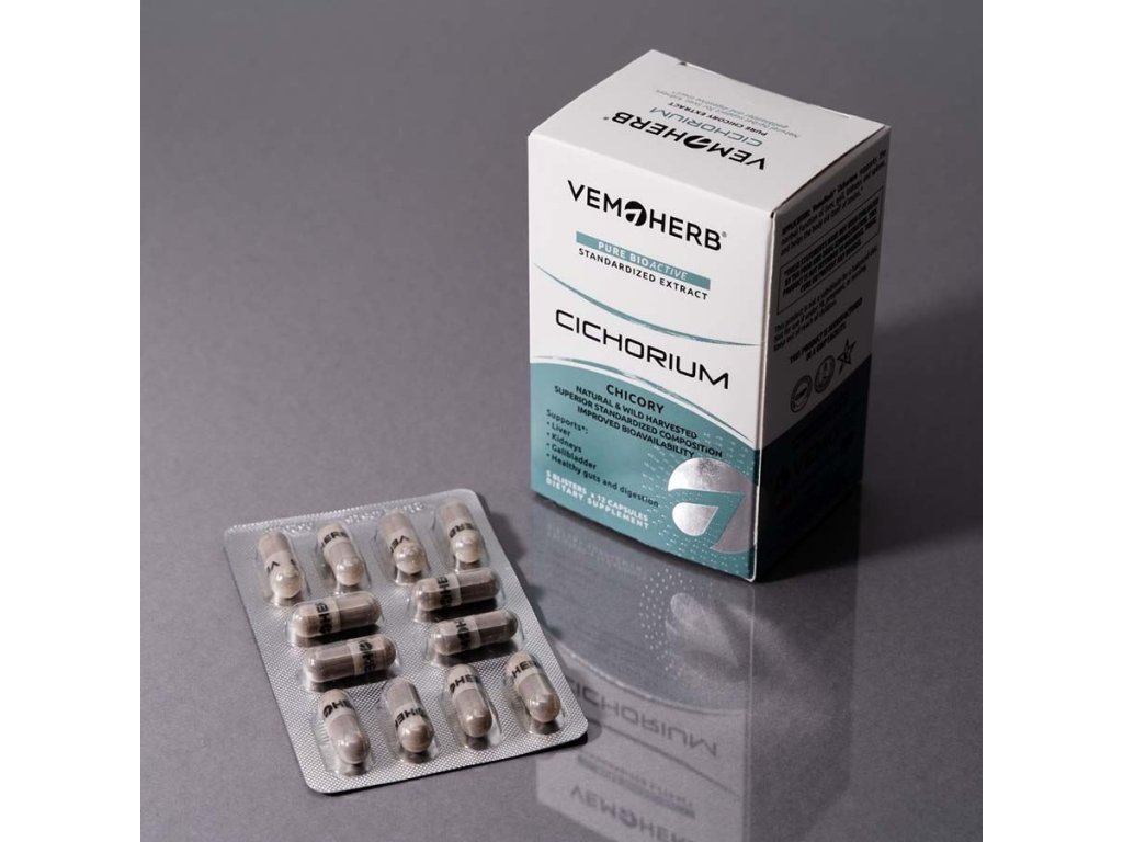 VemoHerb Cichorium v novém praktickém balení v blistrech. Suchý extrakt z nadzemní části rostliny Cichorium intybus (Čekanka obecná). Obsahuje minimálně 8 % flavonoidů determinovaných jako apigenin, 10 % kumarinů determinovaných jako eskulin a nejméně 5 % taninových sloučenin determinovaných jako tanin. Mimo to obsahuje ještě celou řadu dalších biologicky aktivních látek – kumarinové glykosidy cichoriin a eskuletin a další. Účinky těchto látek souvisí s činností a ochranou jater, činností a stavem žlučníku, podporou trávení a chuti k jídlu.