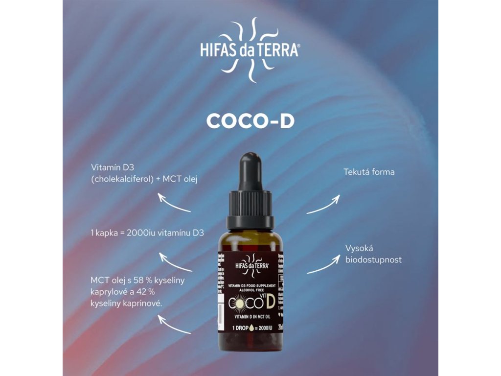 Vitamín D3 je v tuku rozpustný vitamín, který je nejefektivněji absorbován, pokud je konzumován spolu s lipidy, například s MCT olejem získaným z kokosového oleje. MCT oleje obsažené v Coco-D posilují biodostupnost silněji ve srovnání s LCT (long chain) lipidy v olivovém nebo slunečnicovém oleji, které se do těla vstřebávají déle. Coco-D je kompletně bez alkoholu, obsahuje vitamín D3 (cholekalciferol) + MCT olej s 58 % kyseliny kaprylové a 42 % kyseliny kaprinové.