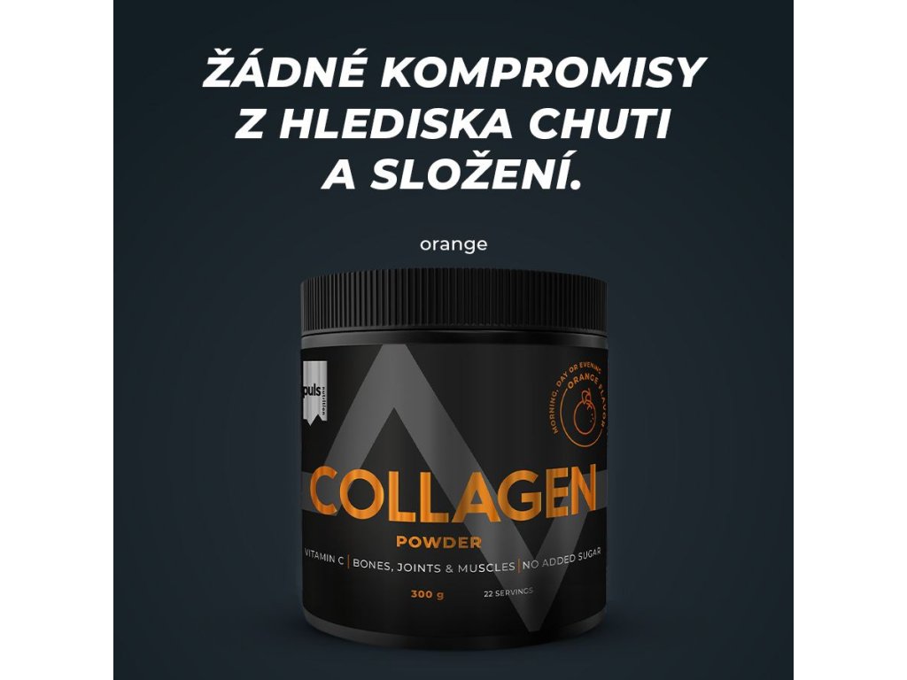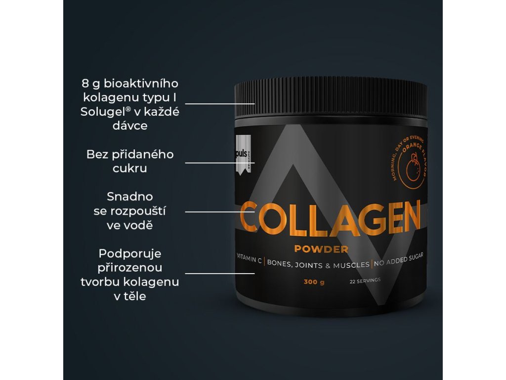 Kolagen je strukturální protein pro pleť, podpůrné tkáně a pohybový aparát. Dopřejte svému tělu jeho benefity spolu s lahodnou pomerančovou chutí. PULS Collagen v práškové formě představuje jednoduchý a efektivní způsob, jak zvýšit příjem kolagenu a podpořit přirozenou tvorbu kolagenu v těle. Díky svěží pomerančové chuti se snadno zařadí do každodenní rutiny. Každá porce obsahuje 8 g hovězího kolagenu typu I a vitamin C, který je nezbytný pro normální tvorbu kolagenu. Bez přidaného cukru.
