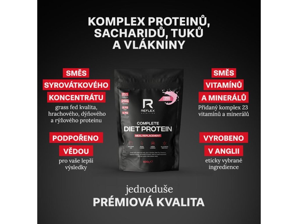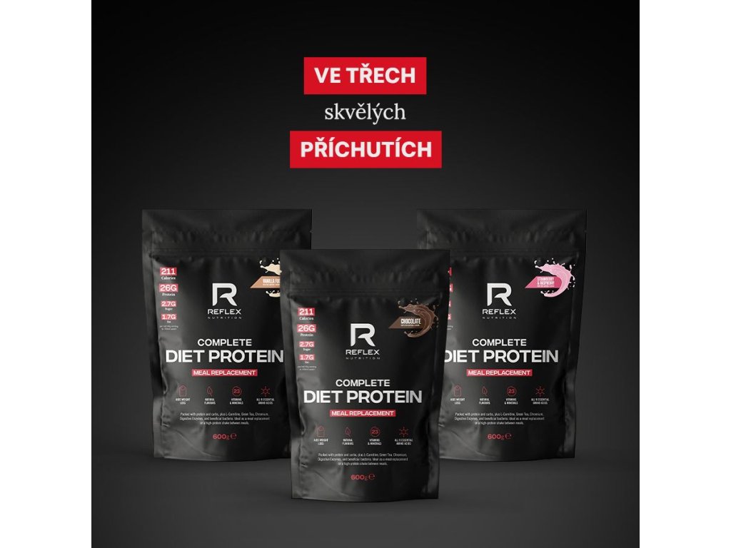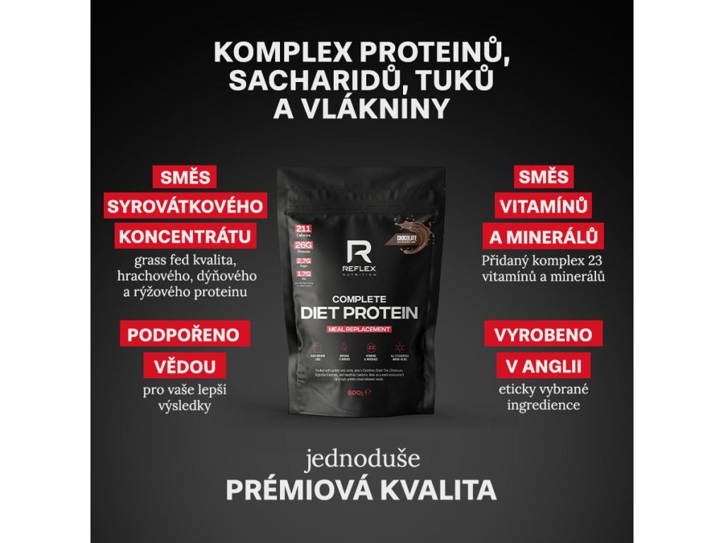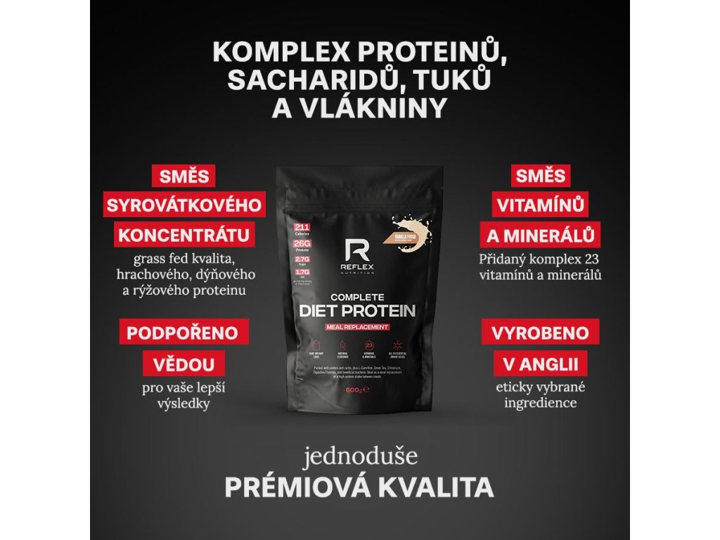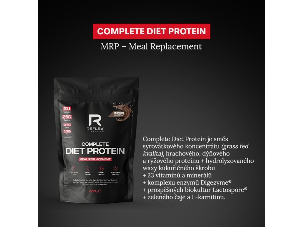 Complete Diet Protein je směs syrovátkového koncentrátu (grass fed kvalita), hrachového, dýňového a rýžového proteinu + hydrolyzovaného waxy kukuřičného škrobu + 23 vitamínů a minerálů + komplexu enzymů Digezyme® + prospěšných biokultur Lactospore® + zeleného čaje a L-karnitinu. Complete Diet Protein je určen jako podpora při spalování nadbytečného tuku nebo při použití poloviční dávky jako vysokoproteinový nápoj po tréninku nebo kdykoli během dne.