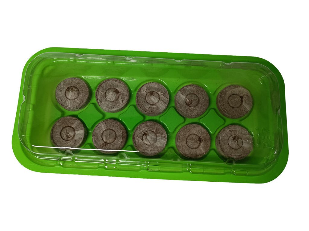 Sada pro předpěstování s deseti tabletami s plastovým krytem pro udržení správného mikroklima pro malé rostlinky či řízky.