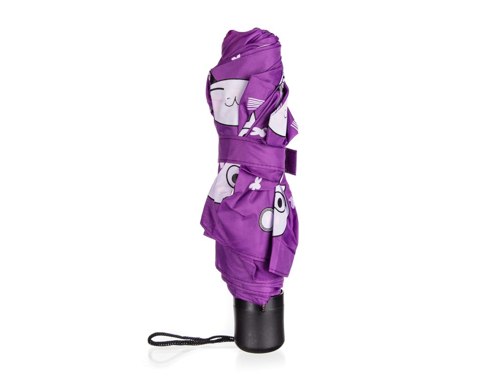 Skládací deštník ve fialové barvě s kočičkami, slouží k ochraně proti dešti a přímému slunci.