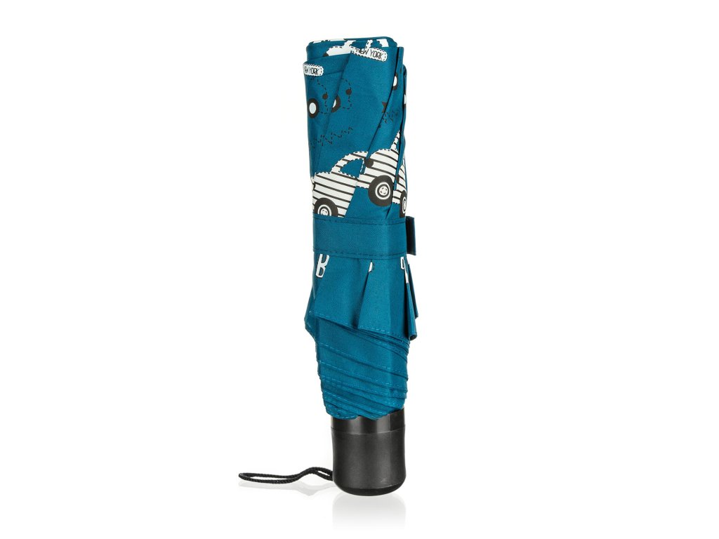 Skládací deštník v modré barvě s autíčky, slouží k ochraně proti dešti a přímému slunci.
