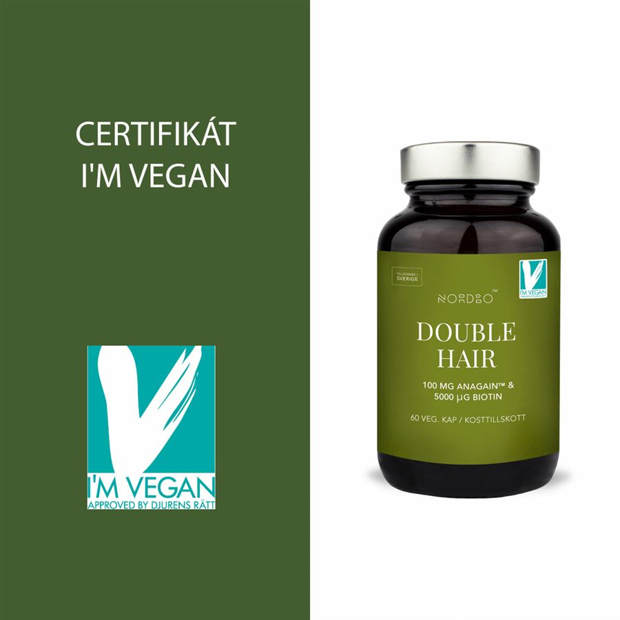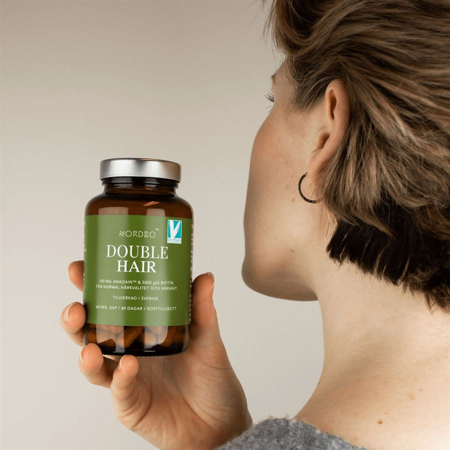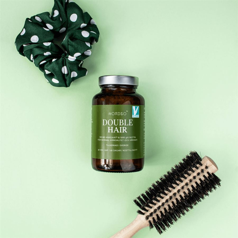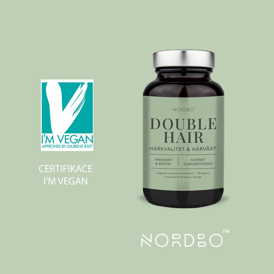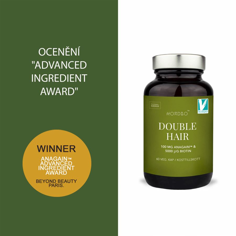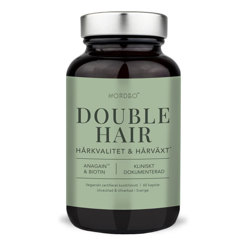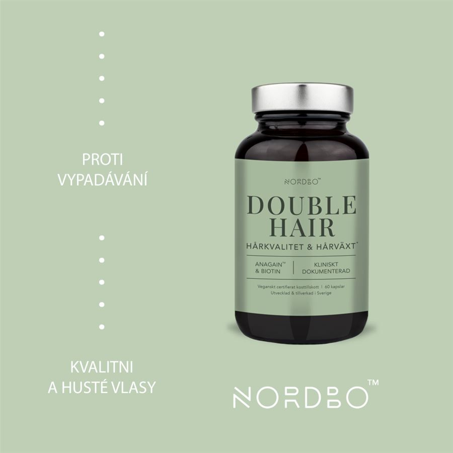 Nordbo Double Hair je velmi precizně zacílený doplněk stravy kombinují patentovaný extrakt AnaGainTM z BIO hrachových klíčků s vysokou dávkou biotinu. Vlastnosti těchto dvou složek jsou synergní a souvisejí se stimulací vlasových folikul, redukcí ztráty vlasů a jejich kondicí. AnaGainTM je speciální extrakt z hrachový klíčků, které jsou bohaté na složky aktivující buňky ve vlasových folikulech. Obnovují v nich mikrocirkulaci živin. Vlastnosti biotinu souvisejí s produkcí keratinu, který zvyšuje kvalitu vlasů. AnaGainTM byl testován v klinické studii s jedinci trpícími středně závažným vypadáváním. Po dvou měsících se snížila ztráta vlasů o 37 % a došlo k viditelnému zpevnění vlasových vláken.