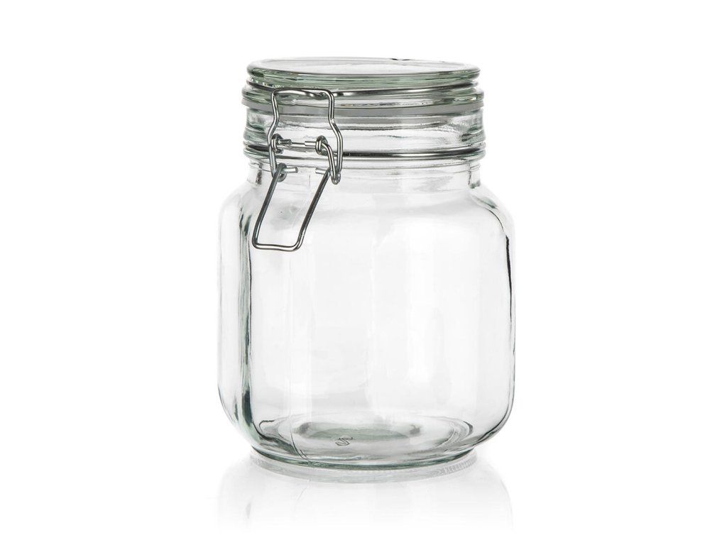 Skleněná hermetická dóza EREA 1 l se skleněným víčkem a kovovým zavíracím patentem.