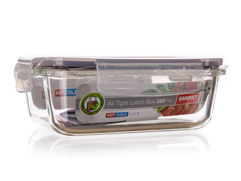 Dóza LORA obdélníková 0,55 l, 17,5 x 13 x 5,5 cm, skleněná + PP víčko TRA/BORDO.