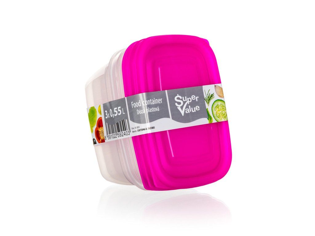 3dílná sada dóz na potraviny SUPER VALUE obsahuje 3 dózy o objemu 0,55 l, vhodné pro skladování různých potravin. Dózy jsou vyrobené z plastu a dodávají se s víky v růžové barvě.