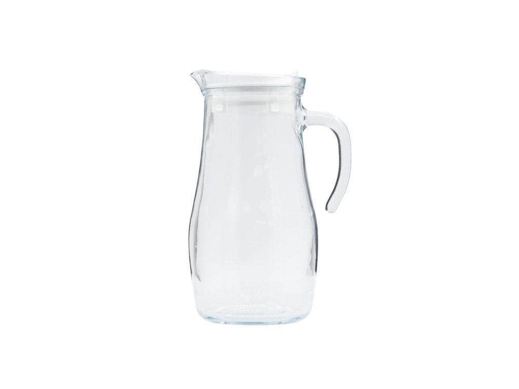 Skleněný džbán s plastovým víčkem a skleněnou rukojetí pro lepší úchop.
