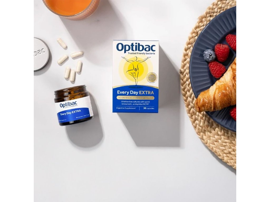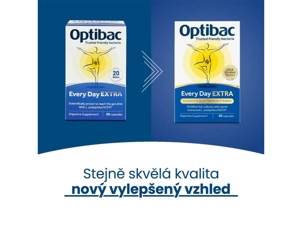 Optibac Every Day EXTRA je doplněk stravy s obsahem vysoké dávky komplexu vysoce kvalitních probiotik určeného pro každodenní podporu. Hodí se pro muže i ženy, lze jej užívat jako podporu obranného štítu, při vysoké zátěži, při rekonvalescenci, při užívání antibiotik nebo kdykoli, když cítíme, že náš zažívací trakt potřebuje pomoci. Every Day EXTRA obsahuje celkem 4 druhy probiotických kultur z kmenů Lactobacillus acidophillus NCFM®, Lactobacillus paracasei Lpc-37®, Bifidobacterium lactis BI-07®, Bifidobacterium lactis BI-04® v zesílené dávce - celkem 20 miliard v 1 kapsli. Proto se hodí pro podporu např. při náročné rekonvalescenci, při velkých obtížích apod. U všech obsažených probiotik byla ověřena schopnost projít kyselým prostředím žaludku a dostat se až do střeva.