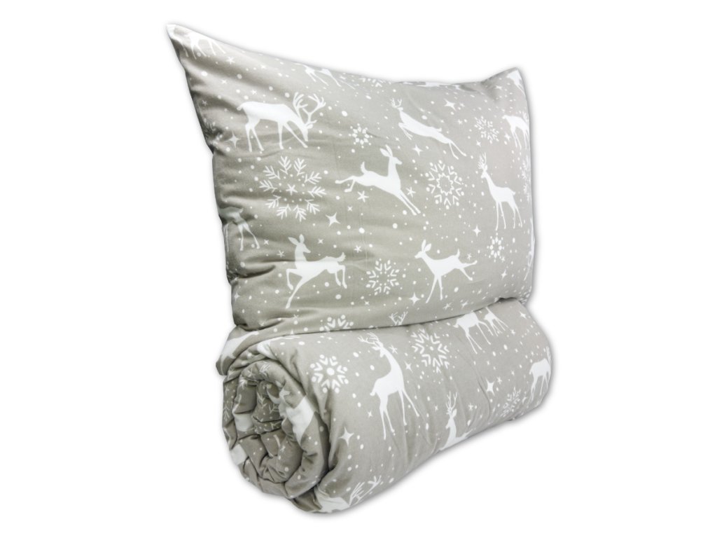 Toto povlečení má zimní a sváteční motiv v tlumené, elegantní šedé barvě s bílými siluetami sobů, sněhových vloček a jemně rozptýlených hvězdiček. Vzor je rozmístěn rovnoměrně po celé ploše a působí velmi klidným, harmonickým dojmem. Bílá barva vzorů krásně kontrastuje se šedým pozadím a vytváří útulnou atmosféru jako stvořenou pro chladné zimní večery. Povlečení navozuje dojem zasněžené krajiny a je ideální volbou pro zimní sezónu nebo jako stylová dekorace v období Vánoc.