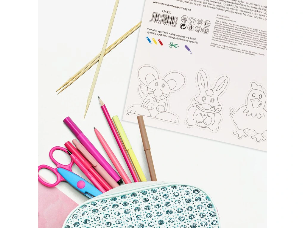 Originální balení: na zadní straně papírové karty, na které je forma připevněna, jsou pro děti připraveny obrázky zvířátek, které si mohou dle vlastní fantazie vybarvit, vystřihnout, nalepit na špejli a hrát s nimi divadlo.