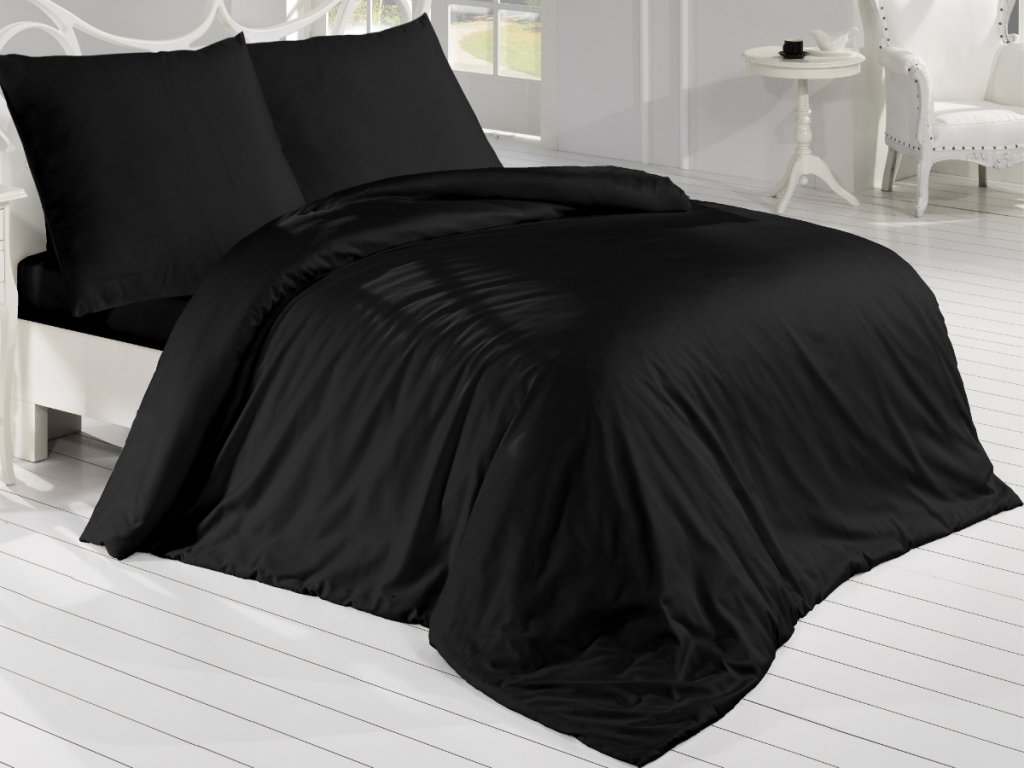 Jednobarevné luxusní černé povlečení satén ze 100% bavlny na francouzskou přikrývku 220x200 a na dva polštáře 70x90cm se zapínáním na zip. Saténová tkanina je velmi jemná a příjemná na omak. Na saténové tkanině jsou tisky výraznější a syté. Povlečení má klasicky šité polštáře, nemá ozdobně šité okraje jako na obrázku.