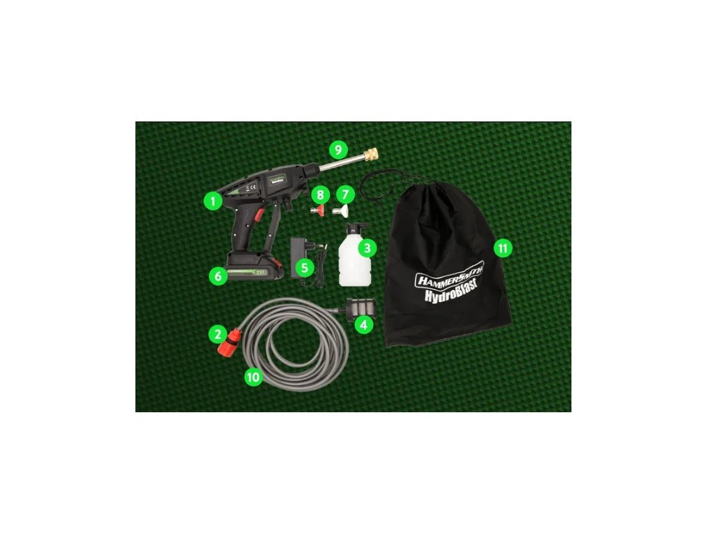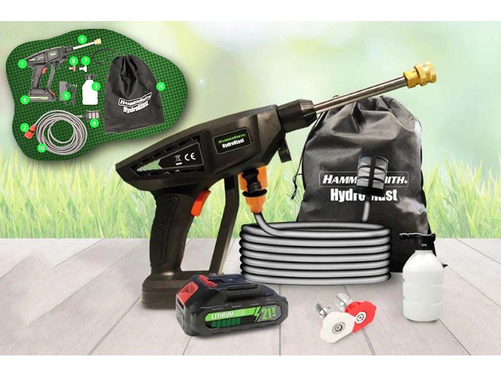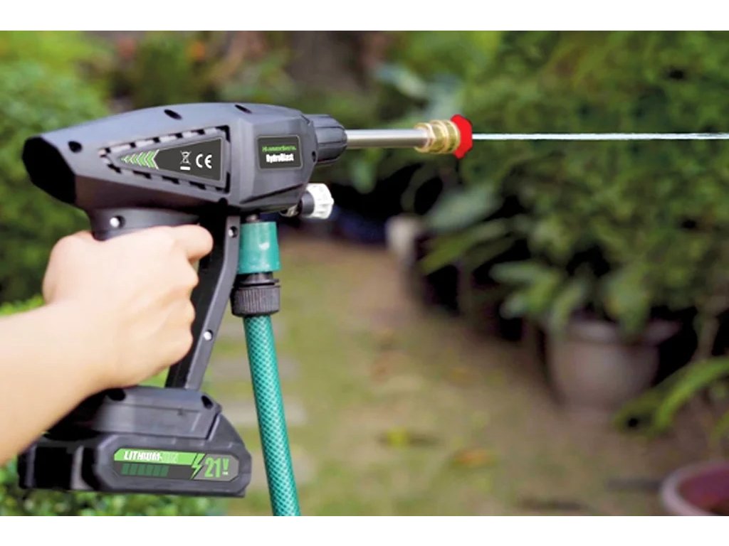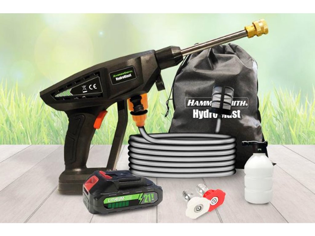 Hammersmith HydroBlast je akumulátorová čisticí pistole navržená pro snadné a účinné tlakové čištění bez nutnosti připojení k vodovodnímu kohoutku nebo elektrické síti. Díky přípojce na zahradní hadici a flexibilní tlakové hadici, kterou lze ponořit do kbelíku s vodou, bazénu nebo jiné nádoby, zvládnete čistit kdekoliv a kdykoliv. HydroBlast je tlaková pistole (myčka) tlak vody 7bar.