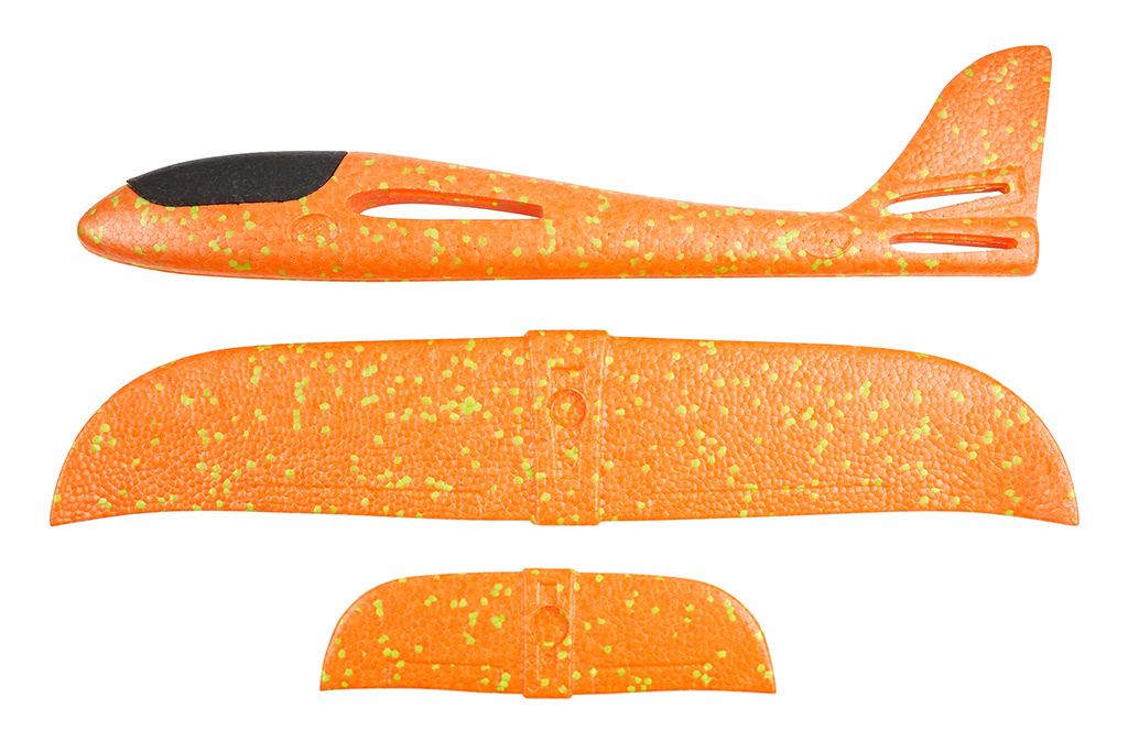 Odolné házedlo z EPP pěny, které děti jen tak nezničí a zabaví je na dlouhou dobu. Házedlo jednoduše složíte zasunutím křídel do otvorů v trupu a je připravené k házení. Ocasní křídlo lze umístit do otvoru pro plachtění nebo pro loping (trup má na to připravené dva otvory). Rozměry složeného letadla jsou cca 49 x 48 x 13 cm Barva oranžová