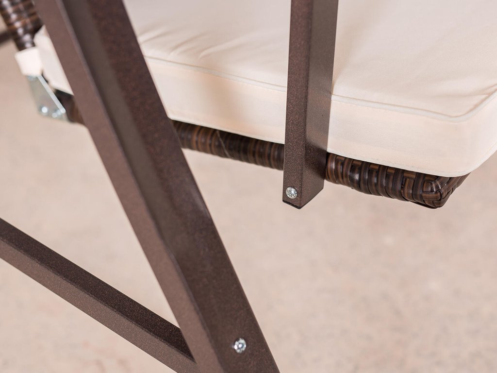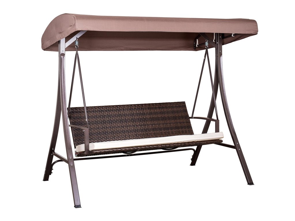 Zahradní houpačka CAPRI z umělého ratanu, kovová konstrukce je ošetřenou práškovým lakováním v hnědé barvě, střecha je vyrobena z polyesteru.