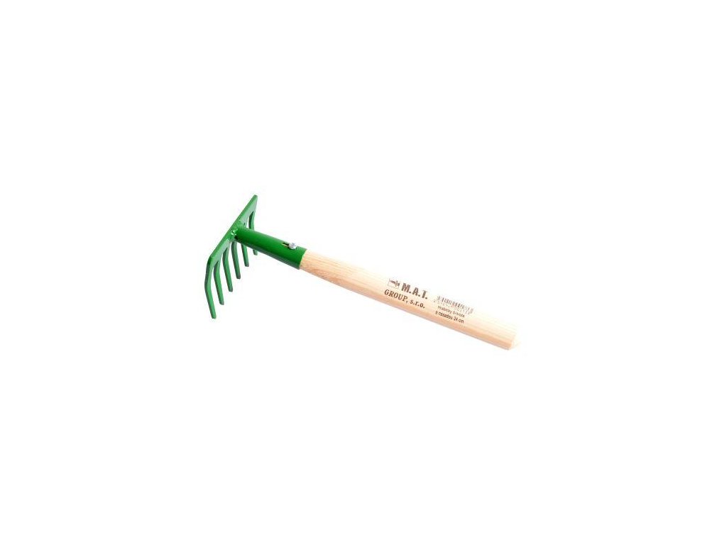Lehké a odolné kovové hrabičky s dřevěnou násadou, vhodné pro běžné práce na zahrádce.