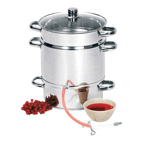 Velký nerezový hrnec na odšťavňování, vhodný pro přípravu domácích šťáv a marmelád.
