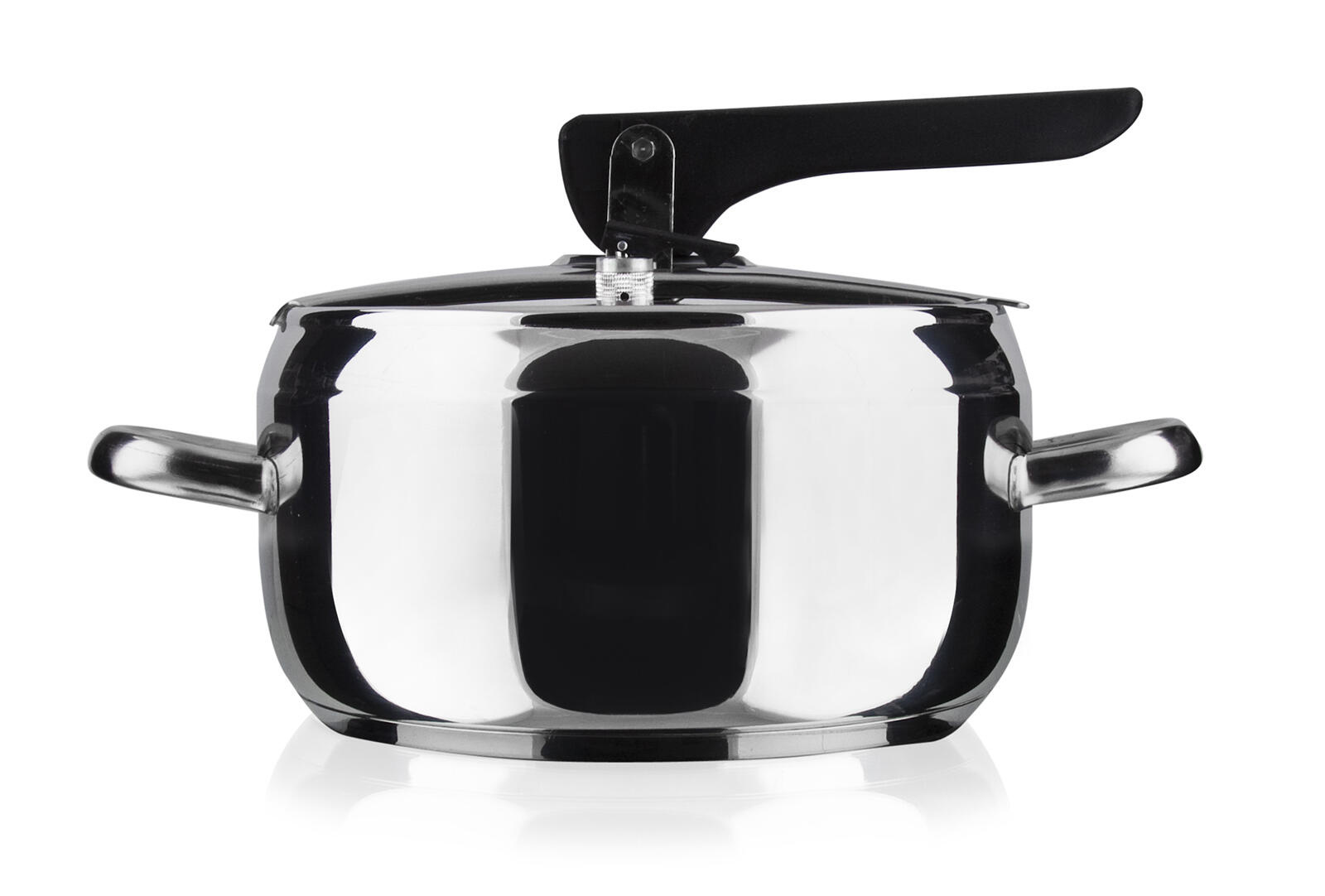 Nerezový tlakový hrnec s pákovým uzávěrem.