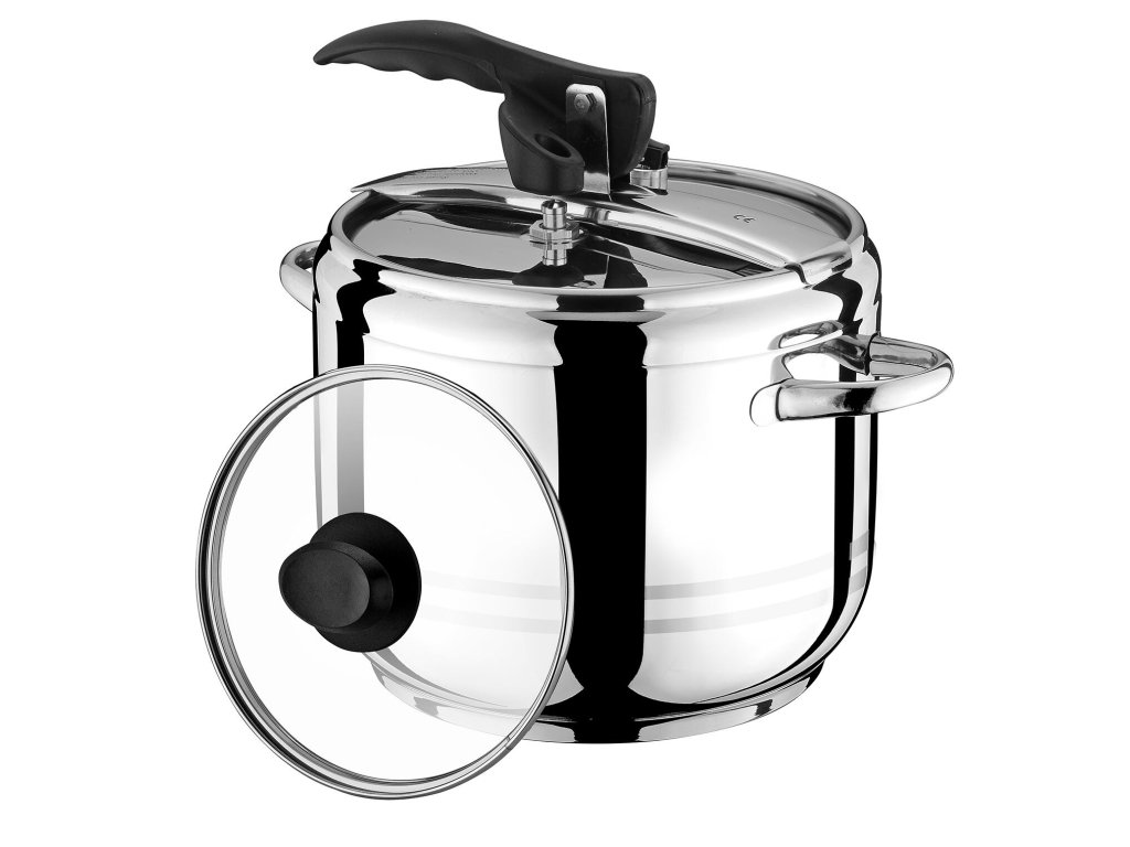 Nerezový tlakový hrnec s pákovým uzávěrem a skleněnou poklicí.