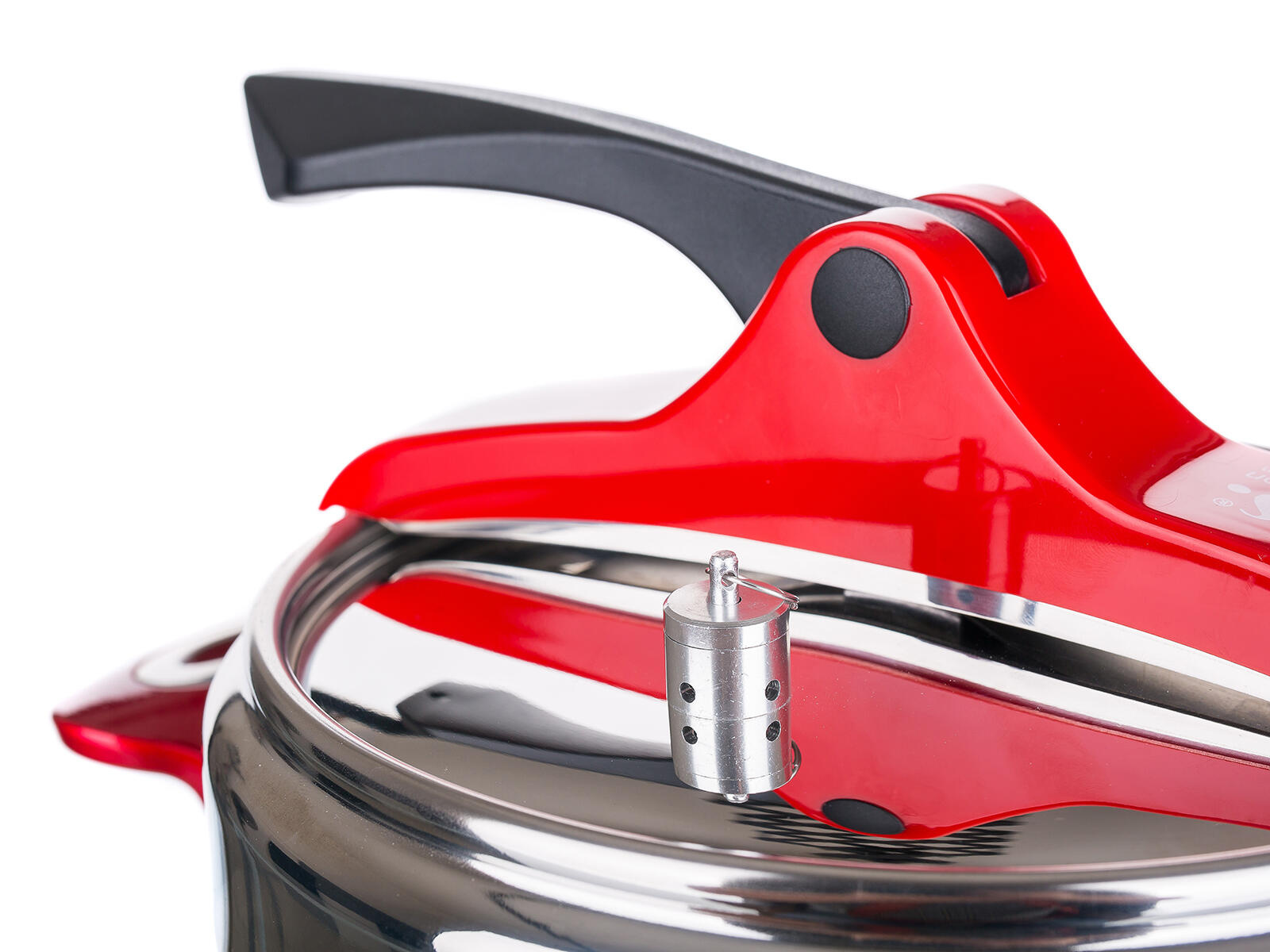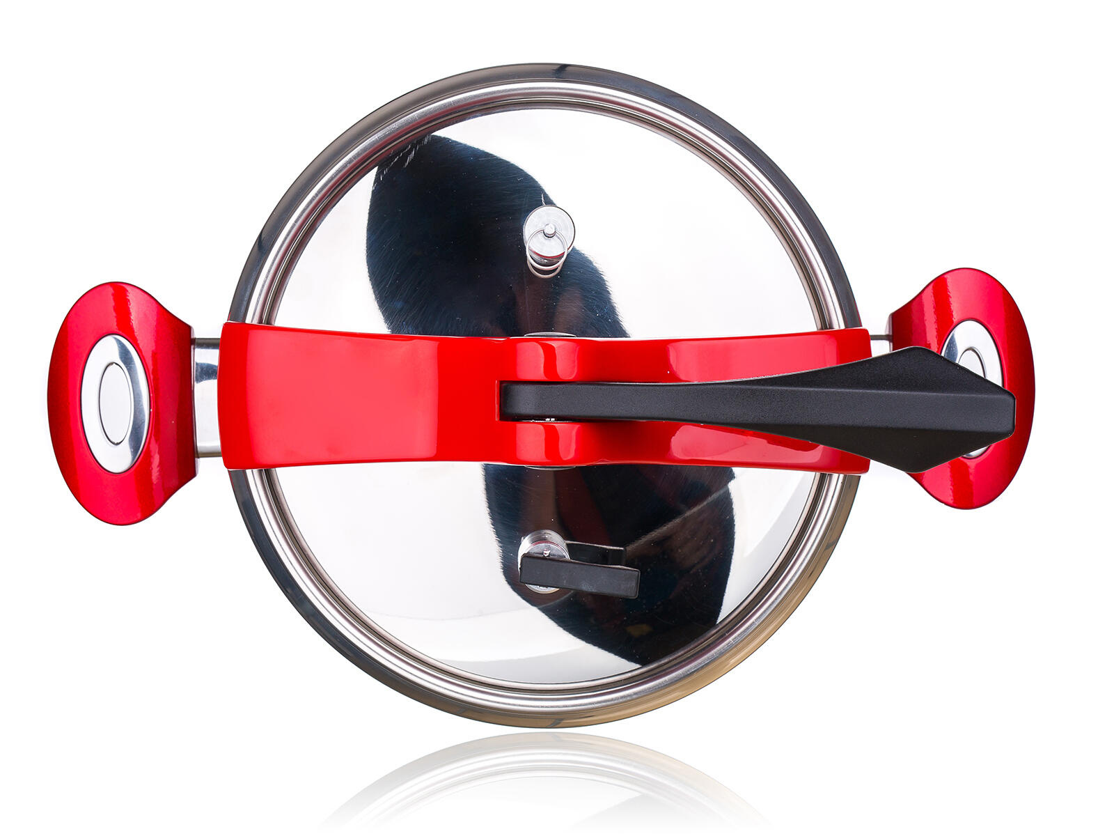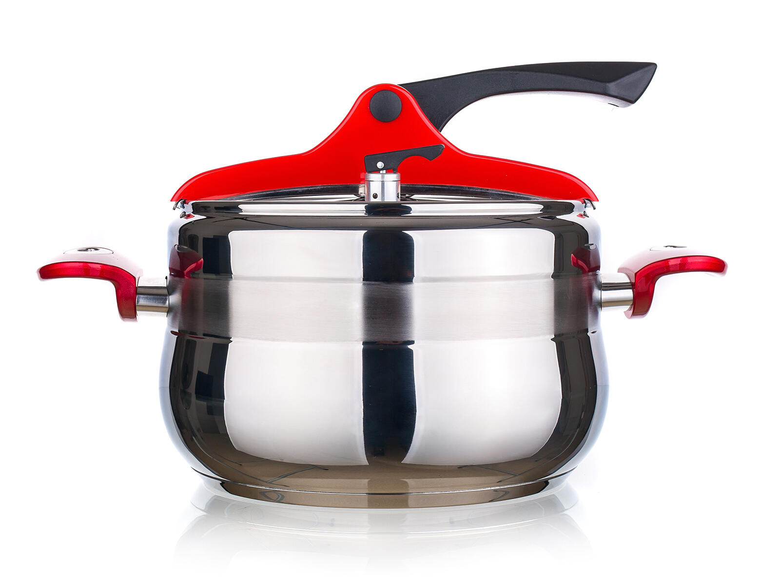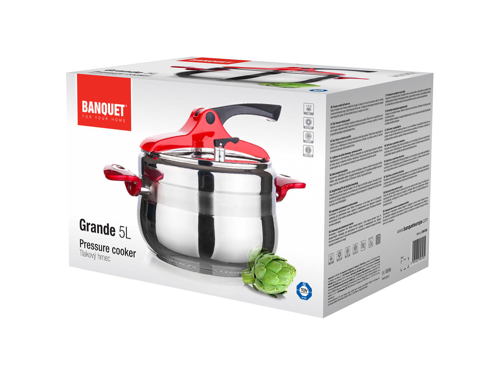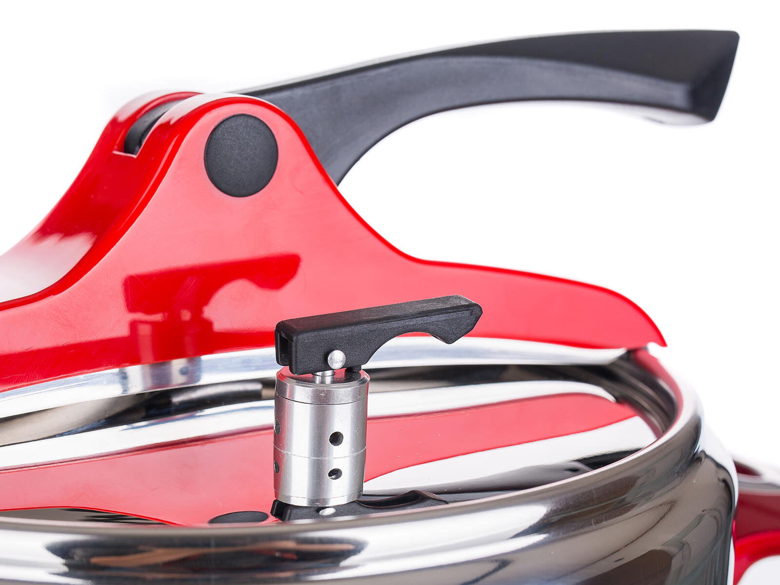 Tlakový nerezový hrnec GRANDE Red 5 l (bezpečný využitelný objem 3,3 l), s pákovým uzávěrem a trendovým baňatým tvarem.