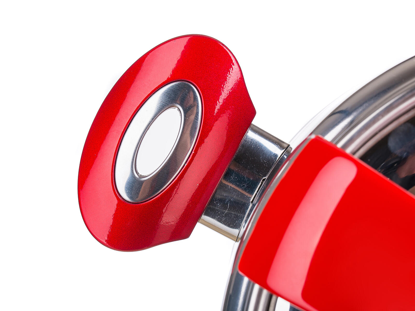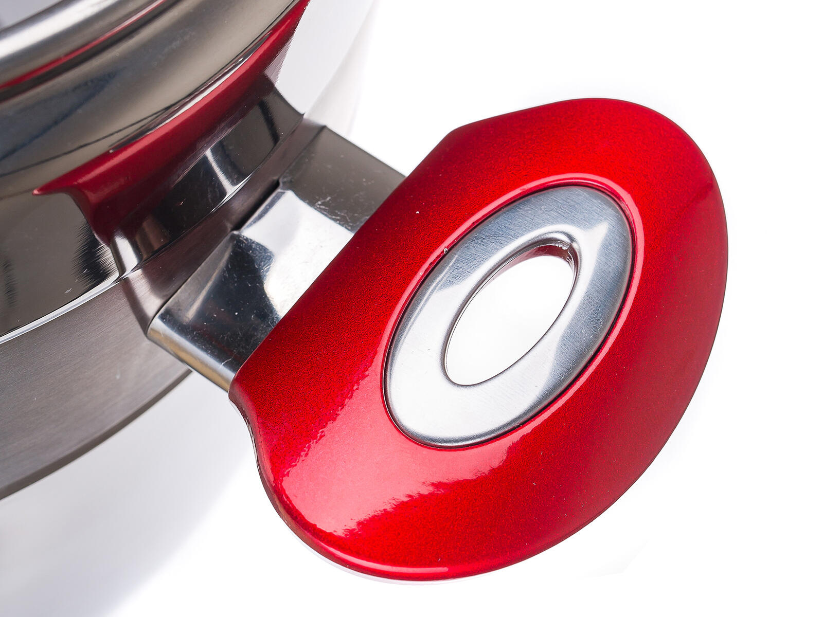 Moderní barevné prvky na uzávěru a rukojetích v červené barvě.