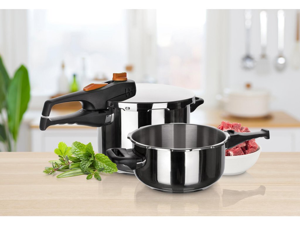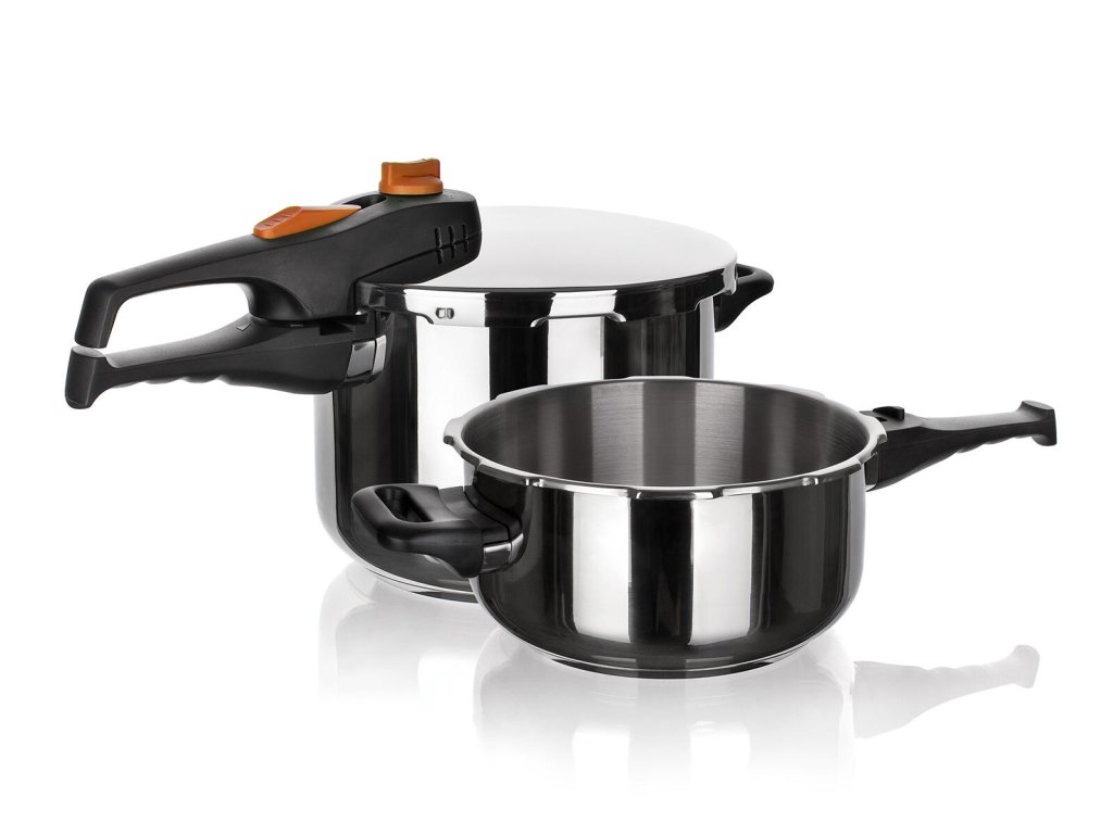Sada nerezových tlakových hrnců ADAGIO 4 / 6 l, s bajonetovým uzávěrem.