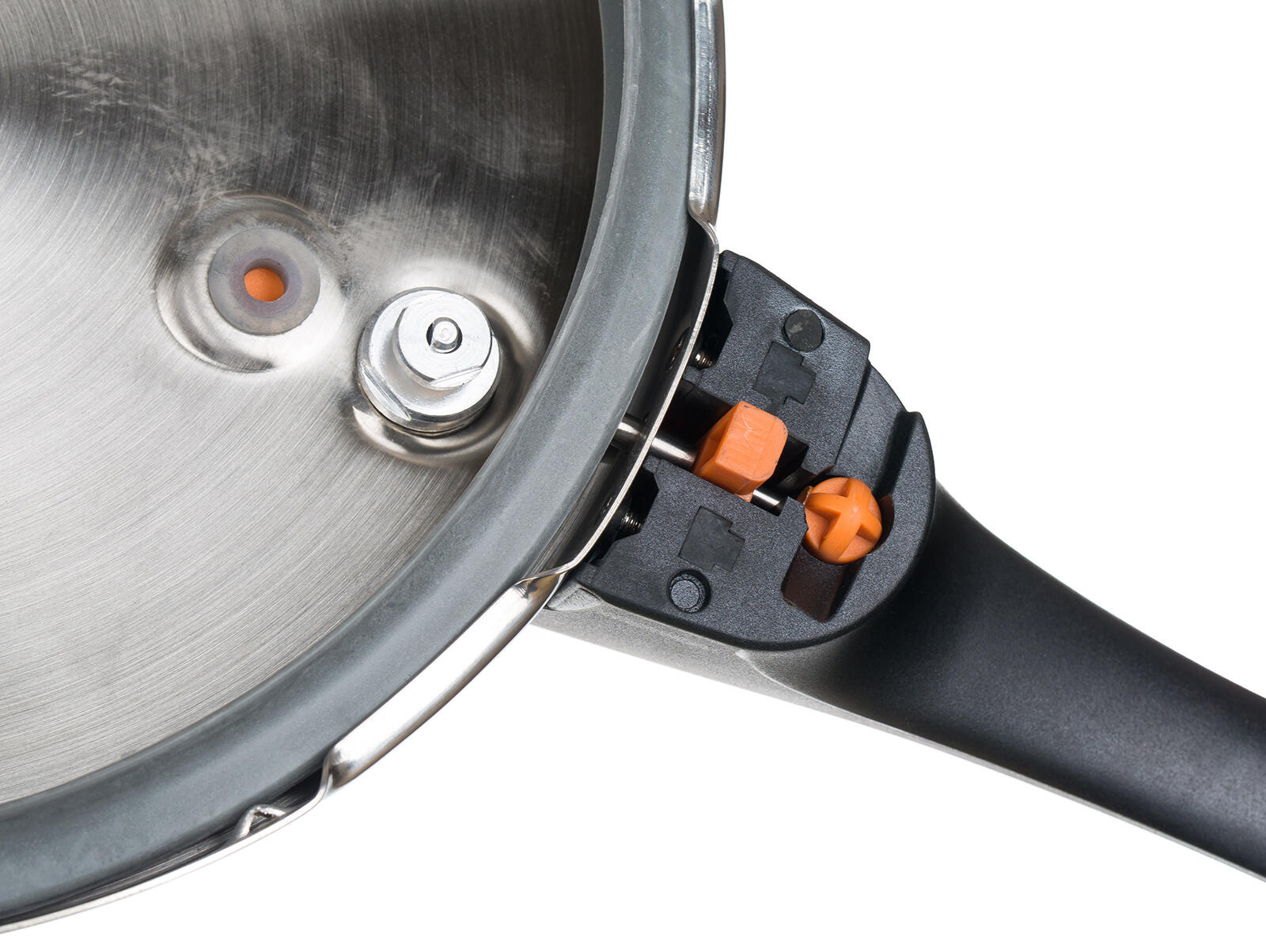 Poklice obsahuje pracovní ventil, pojistku proti otevření natlakovaného hrnce a silikonové těsnění.