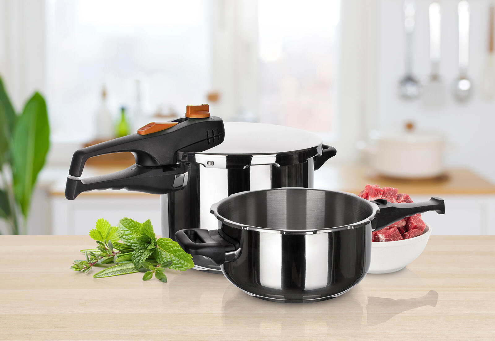 Sada nerezových tlakových hrnců ADAGIO 4 / 6 l, s bajonetovým uzávěrem.