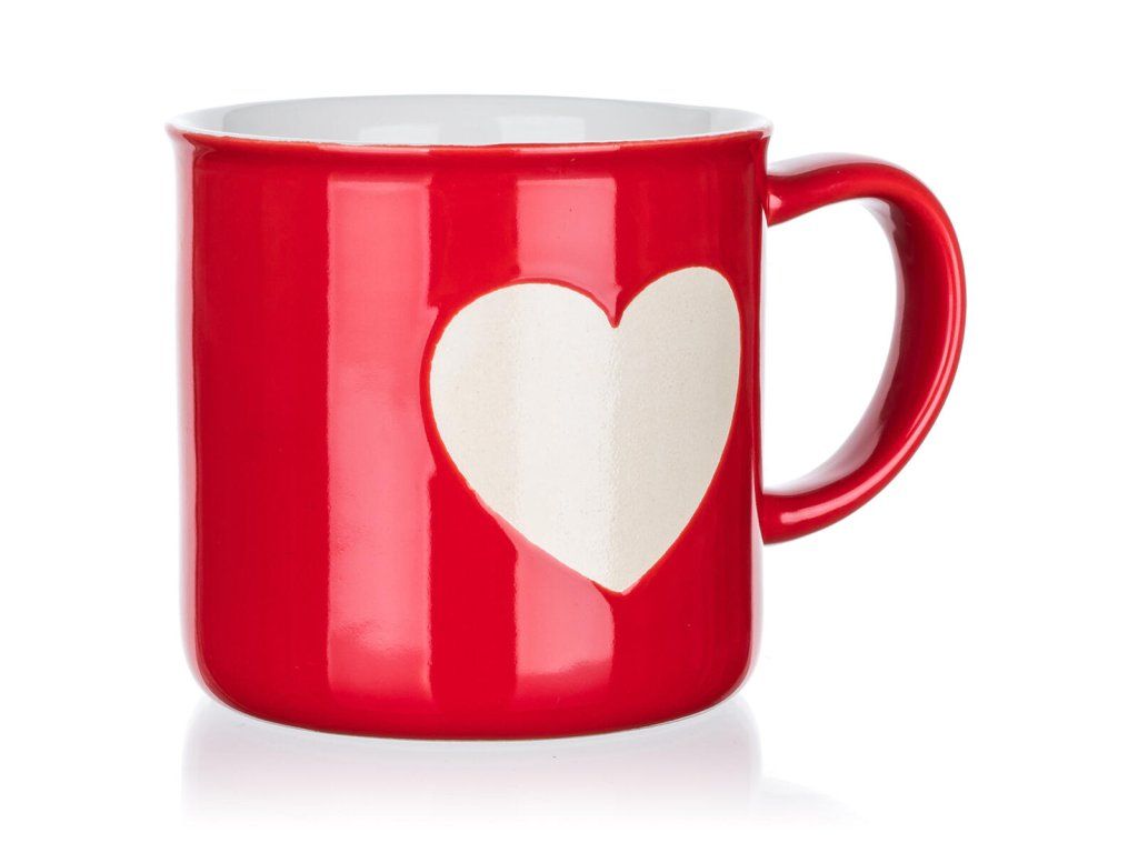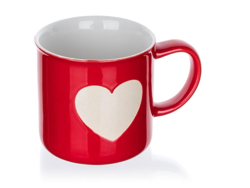 Hrnek 350 ml tvar plecháček se srdcem, červená barva, výška hrnku 8,6 cm, průměr 8,8 cm, materiál - keramika. Hrnek lze používat do mikrovlnné trouby a mýt v myčce na nádobí.