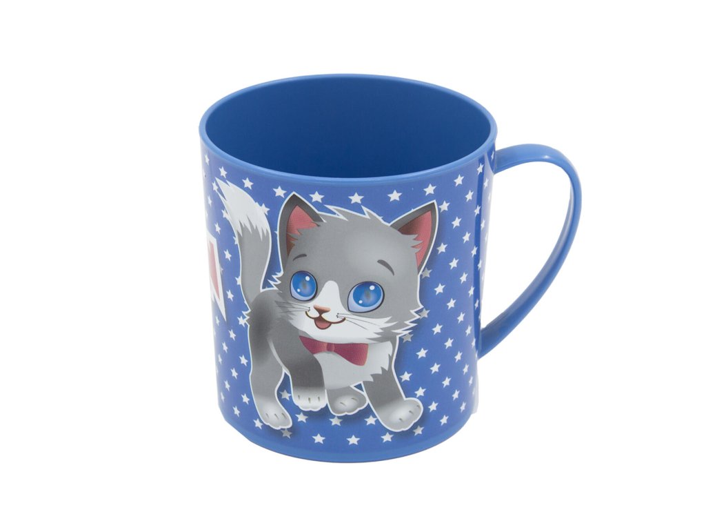 Plastový hrnek s dětským motivem je lehký a dobře padne dětem do ruky.