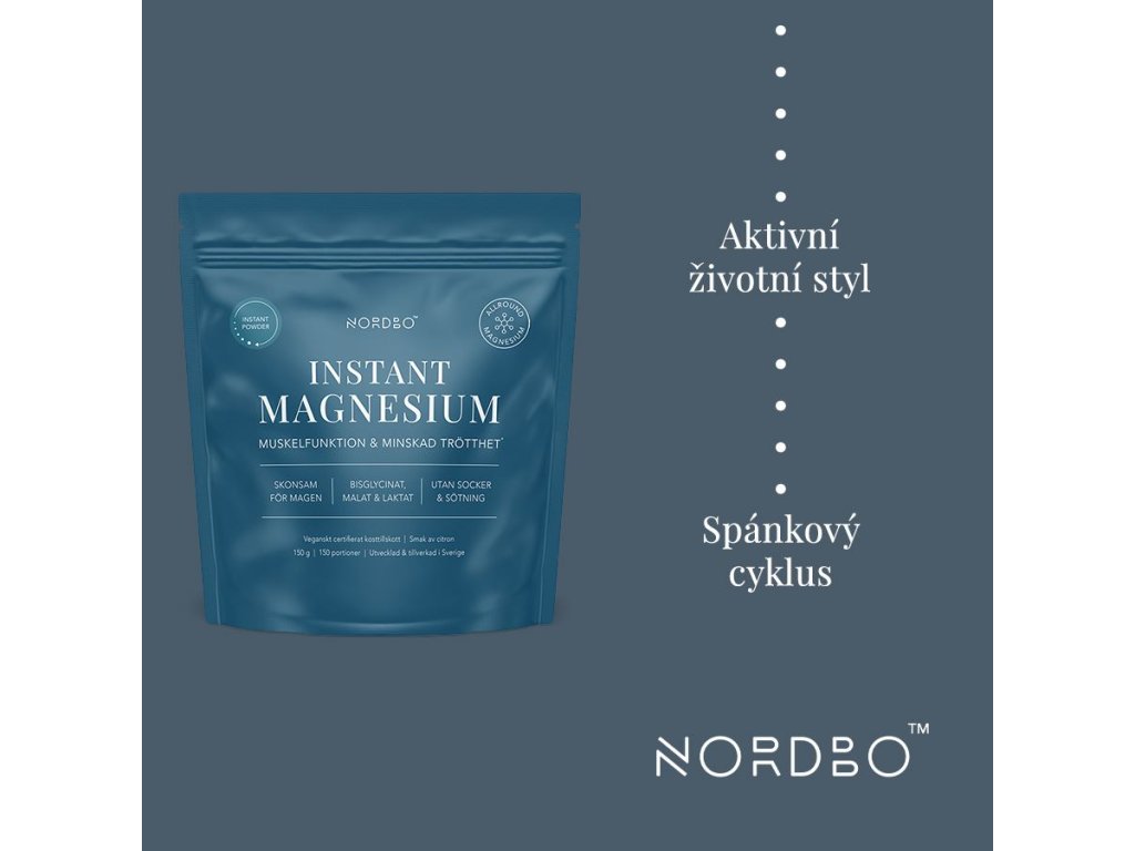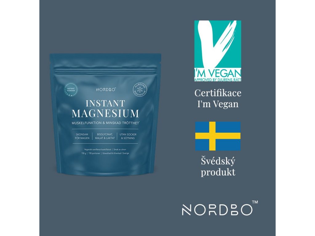 Nordbo Instant Magnesium obsahuje tři organické (chelátová vazba), biologicky vysoce dostupné formy hořčíku. Bysglicinát hořečnatý obsahuje hořčík vázaný na aminokyselinu glycin, jablečnan hořečnatý (malát) obsahuje hořčík vázaný na kyselinu jablečnou a laktát hořečnatý obsahuje hořčík s laktátem. Všechny tři nosiče hořčíku jsou organické a pro tělo velmi důležité: glycin pro celkovou regeneraci, malát pro tvorbu buněčné energie a laktát pro normální činnost srdce.