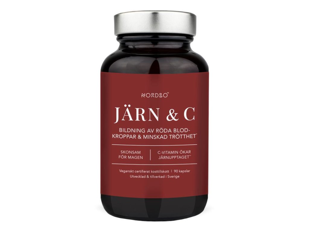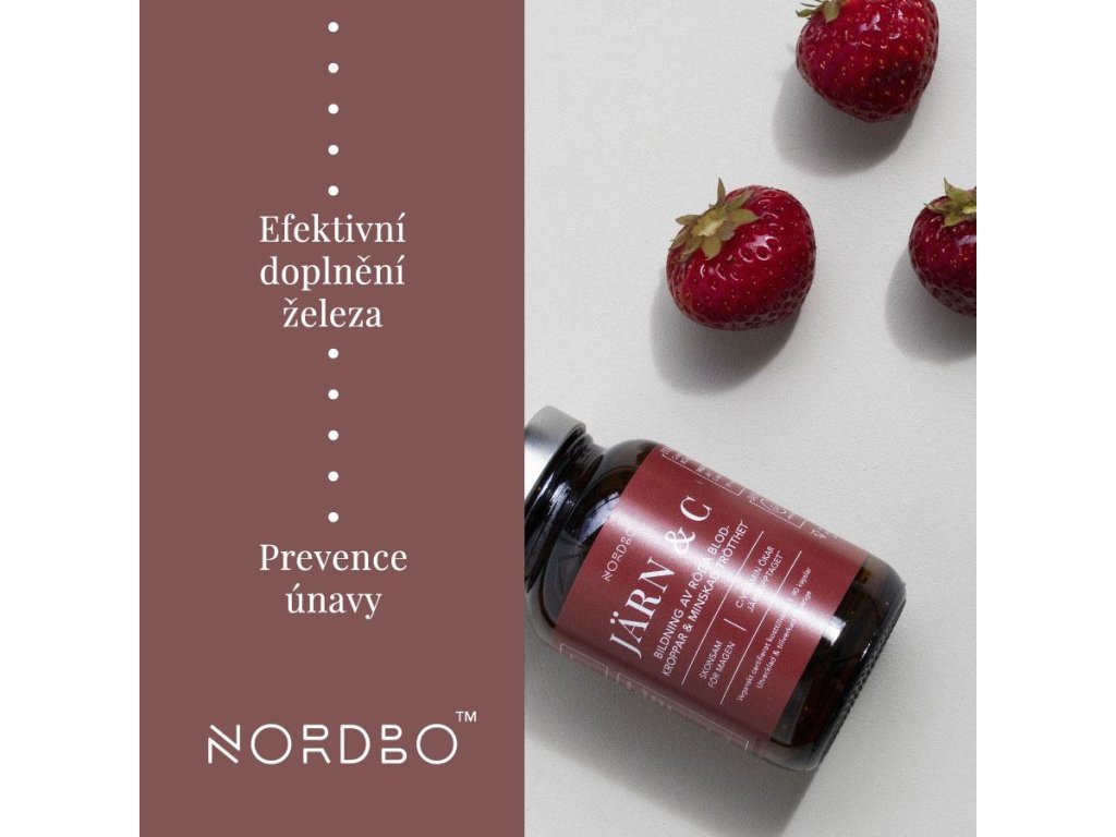 Nordbo Järn & C obsahuje železo ve formě bisglycinátu železnatého, kde je železo navázané chelátovou vazbou na aminokyselinu glycin. Díky tomu má vysokou biologickou využitelnost a je šetrné k zažívacímu traktu. Vlastnosti železa souvisí s činností červených krvinek, s okysličením, s prevencí únavy a vyčerpáním. Vitamín C obsažený v doplňku je ve formě askorbátu vápenatého, který má nízkou kyselost, je tedy stejně jako obsažené železo šetrný k zažívacímu traktu.
