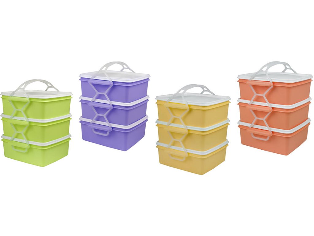 Hranatý box na ukládání a přepravu jídla, složený ze 3 dílů, které jsou navzájem propojené držadlem.