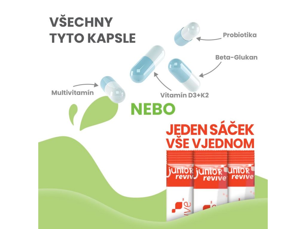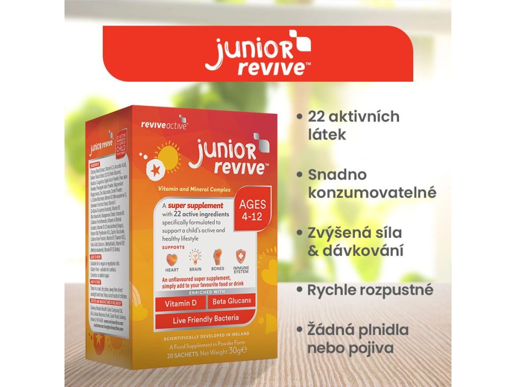 Junior Revive je navržený pro děti ve věku 4-12, užívat jej mohou všechny věkové skupiny. Junior Revive není další obyčejný doplněk, jde o superdoplněk s množstvím účinných látek, které je pro podobné produkty zcela netypické. Junior Revive se od jiných produktů odlišuje velmi silnou kombinací všech potřebných účinných látek jako jsou probiotika, vláknina a beta-glukany s vitamíny a minerály. Prášek je snadno rozmíchatelný ve vodě nebo libovolném nápoji. Jeden sáček dodá potřebné kloubní nutrienty pro celý den. Doplněk je kompletně bez lepku a je slazený steviol-glykosidy.