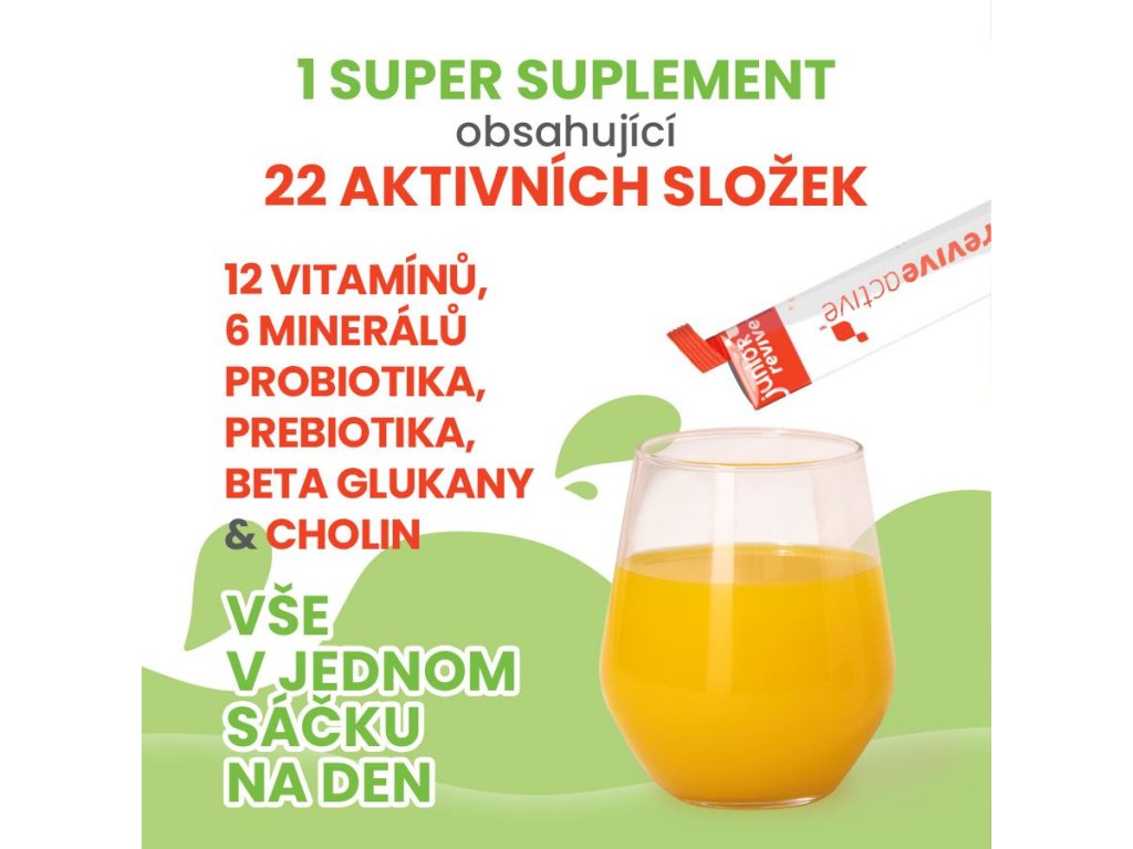 Revive Active je komplexní produkt z kategorie vše v jednom, s obsahem všech nejdůležitějších doplňků stravy v jednom produktu a v jedné denní dávce!