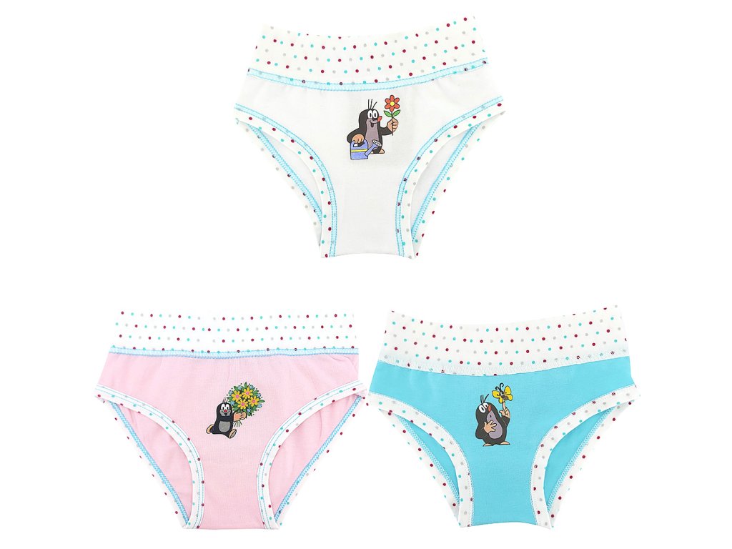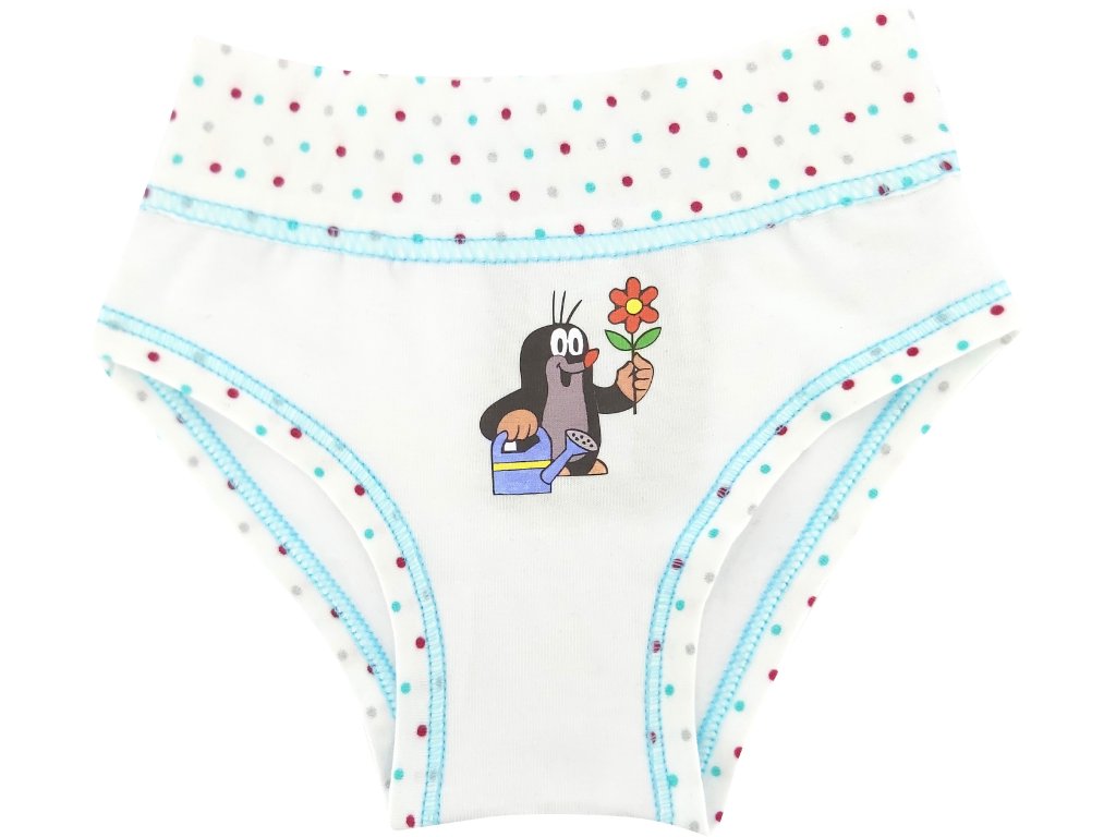 Dívčí kalhotky s Krtečkem KR 006 z kolekce Boma® pro malé slečny. Elastický bavlněný úplet je pružný, vyšší podíl bavlny zaručuje pohodlné nošení během celého dne. Lemy nohaviček a v pase jsou z puntíkatého úpletu bez škrtících gumiček, sešité plochými švy pro maximální pohodlí. Dětské kalhotky mají potisk s obrázkem oblíbeného Krtka, na každodenní nošení jak dělané.